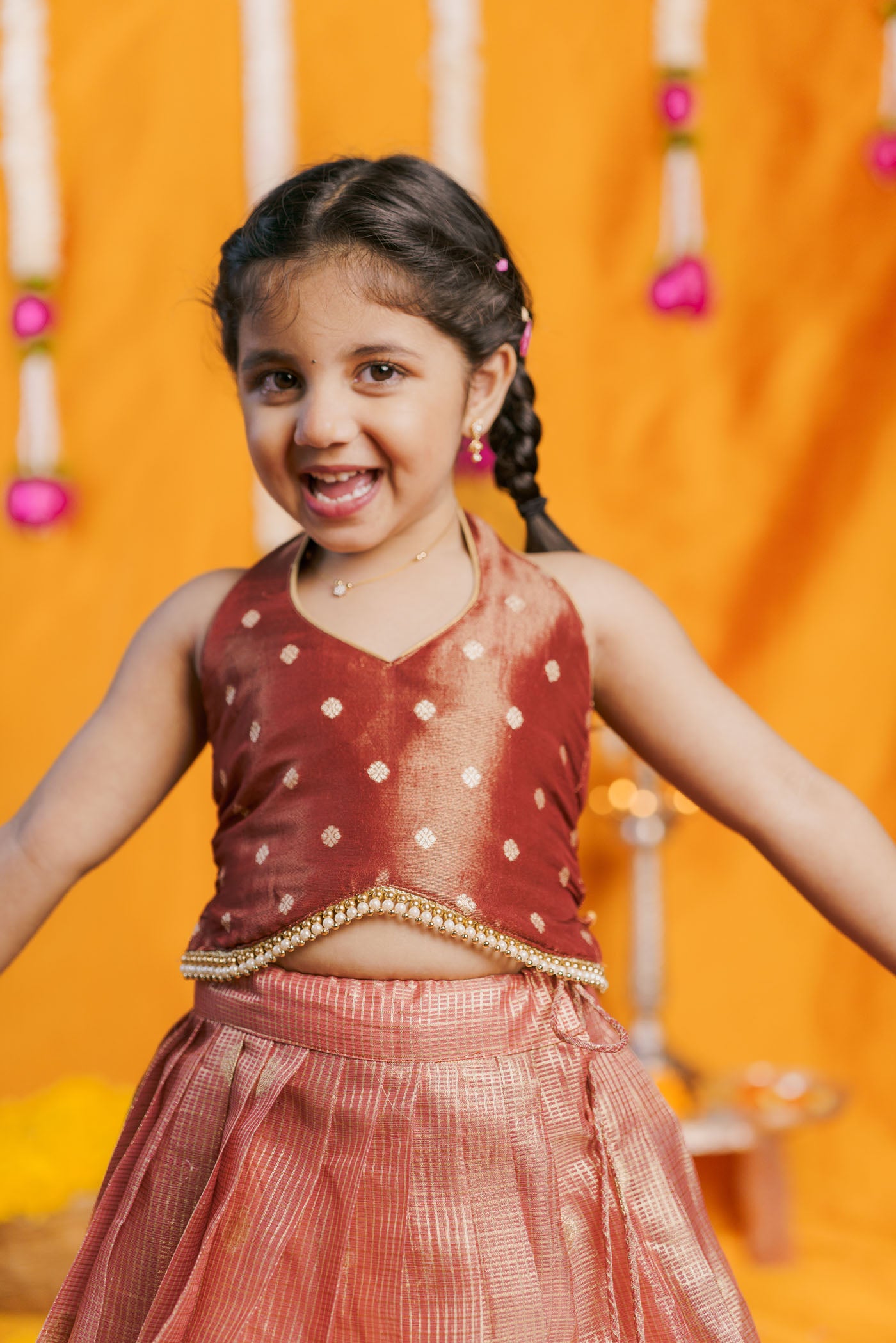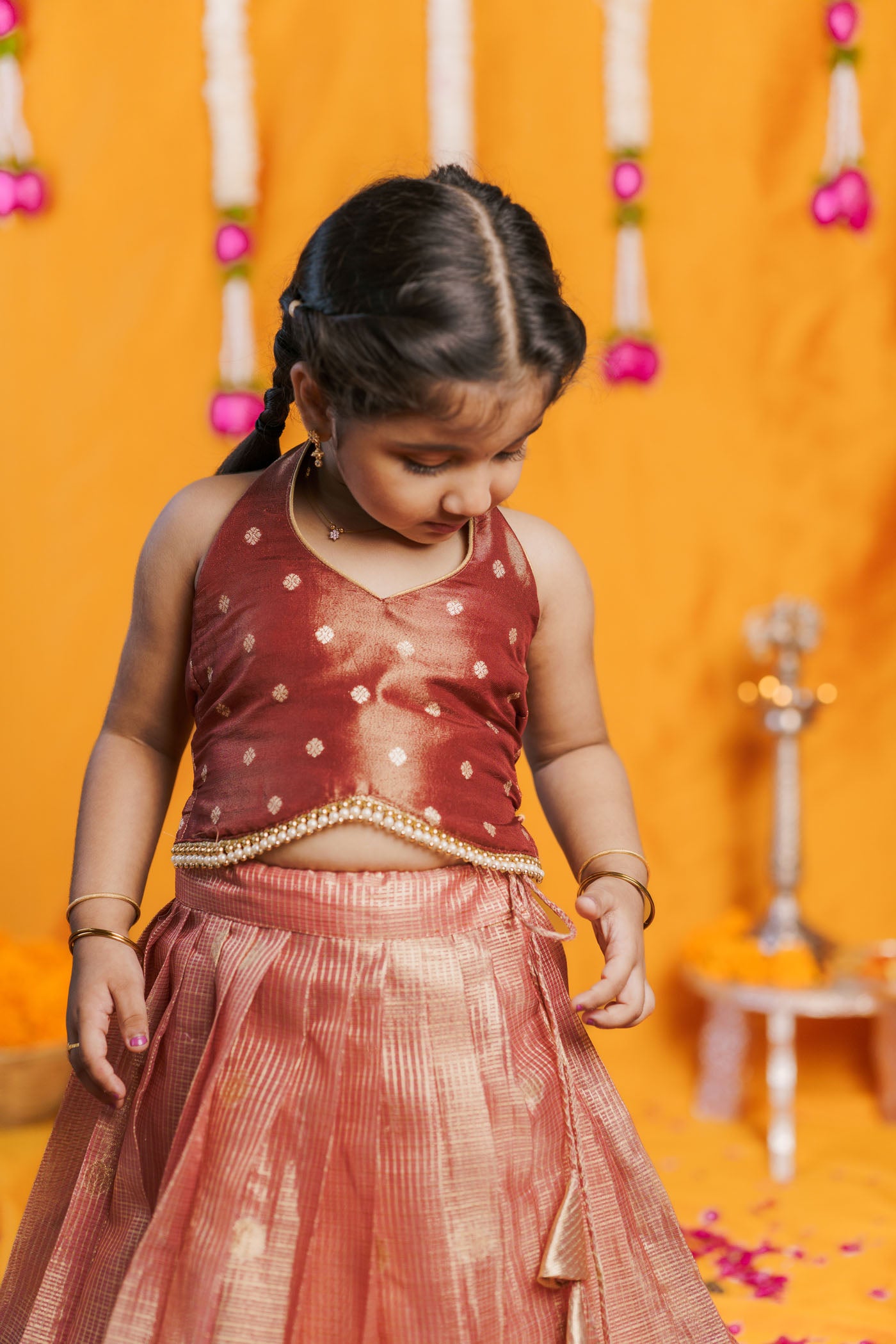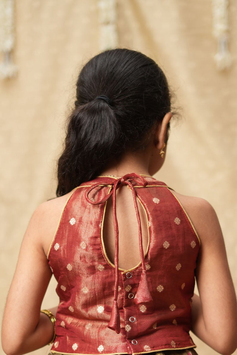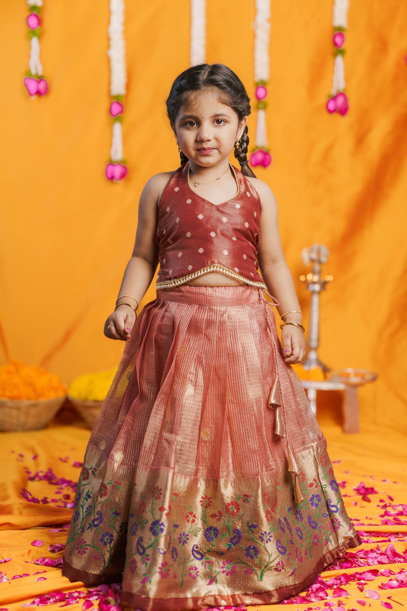 The Gargi Peach Lehenga Mini is a luxurious festive outfit crafted for little girls who love to dress grand yet stay comfortable. The shimmering peach zari-check lehenga features a floral Banarasi paithani border, paired with a rich brown halter blouse in shimmer brocade silk. Designed with a flared silhouette, it is twirl-perfect for weddings, Diwali nights, Navratri celebrations, and family gatherings. The sleeveless halter neckline gives a designer edge, making it a premium pick for cultural occasions.