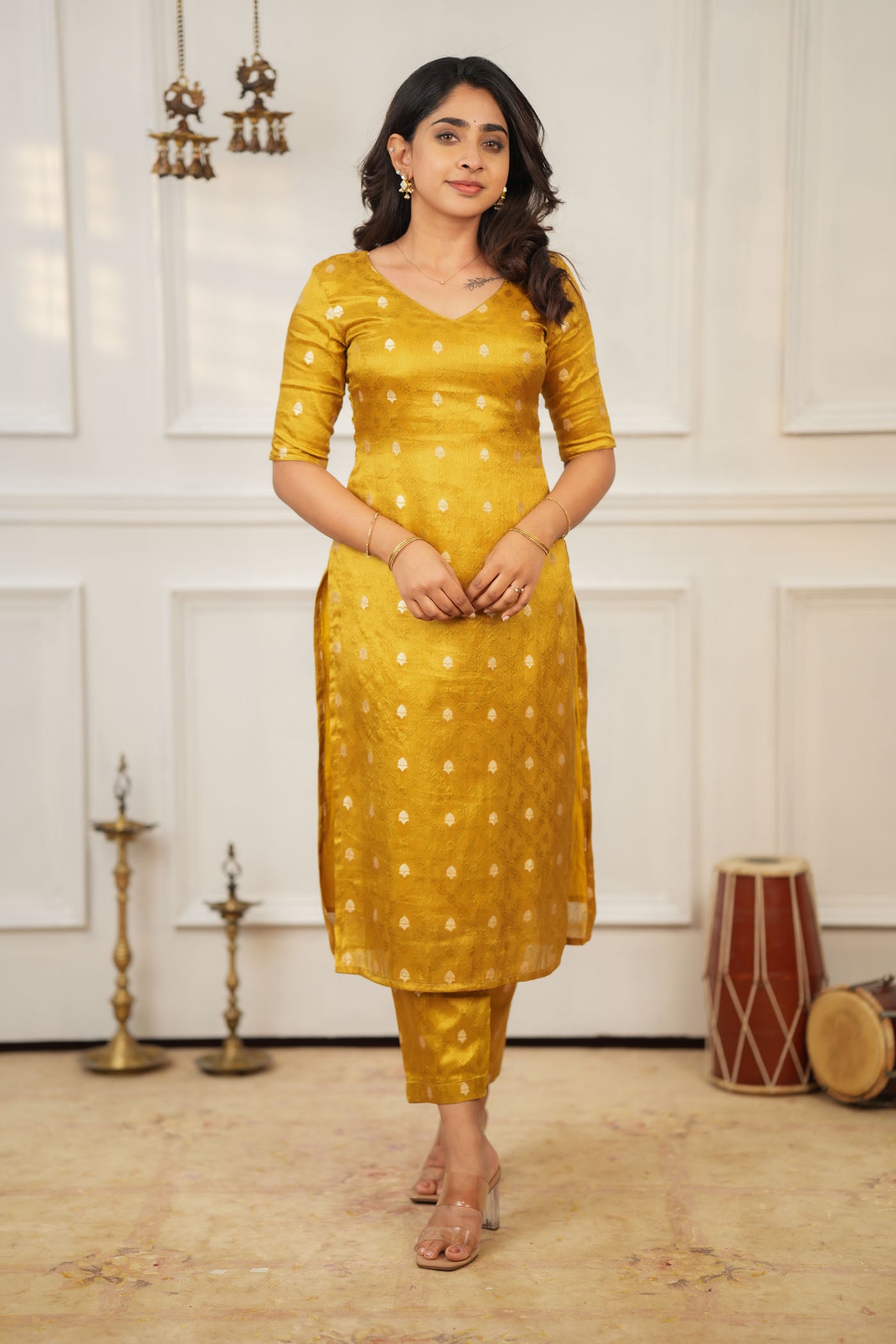 The Ayra Gold Co-Ord Set is an elegant fusion of minimal design and festive charm. Tailored in shimmer brocade silk with subtle zari buttis, this straight kurta paired with slim-fit pants offers both comfort and regality. Perfect for semi-formal gatherings, wedding functions, and festive evenings, Ayra brings understated luxury in a golden hue that never goes out of style.
