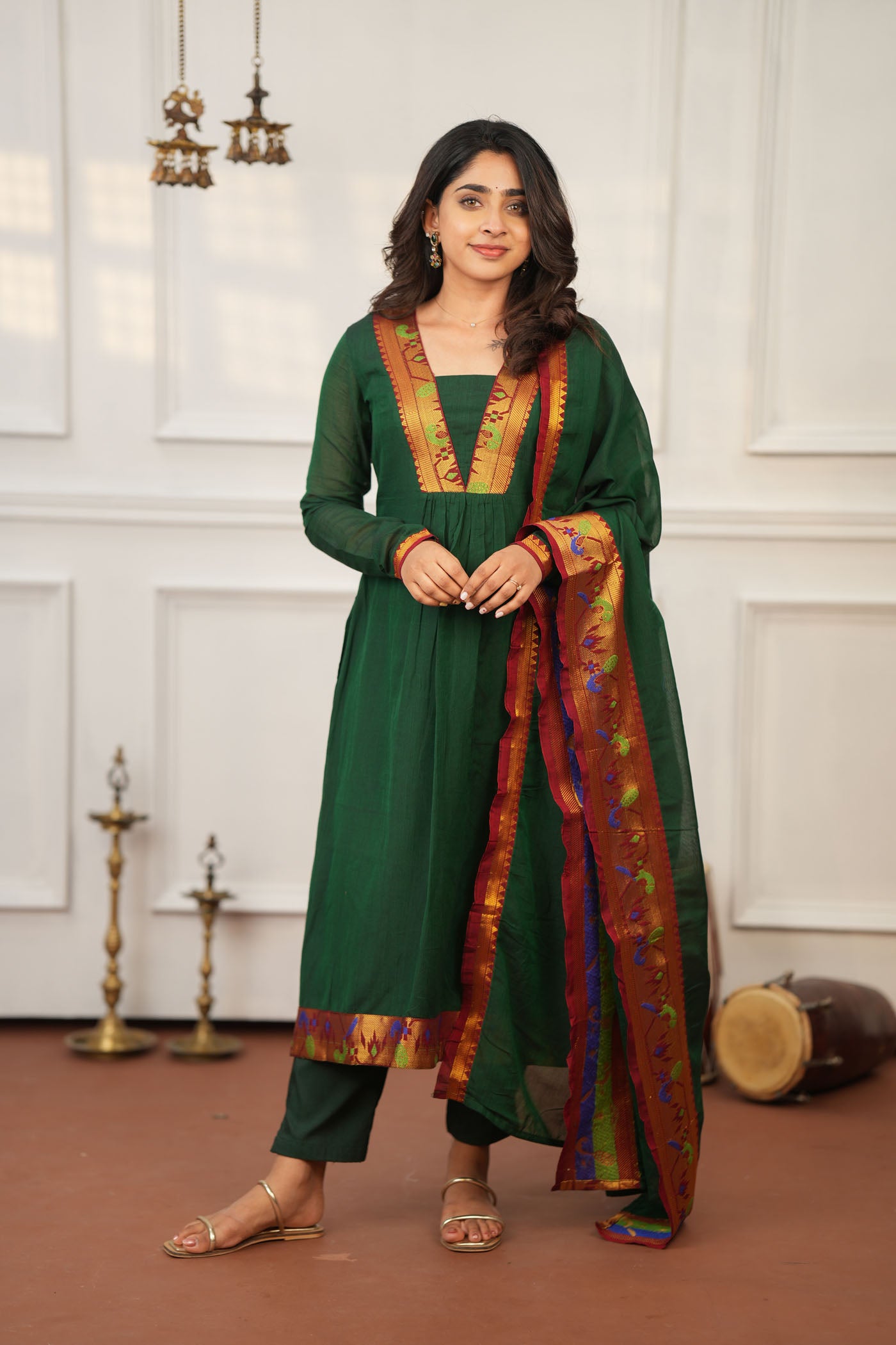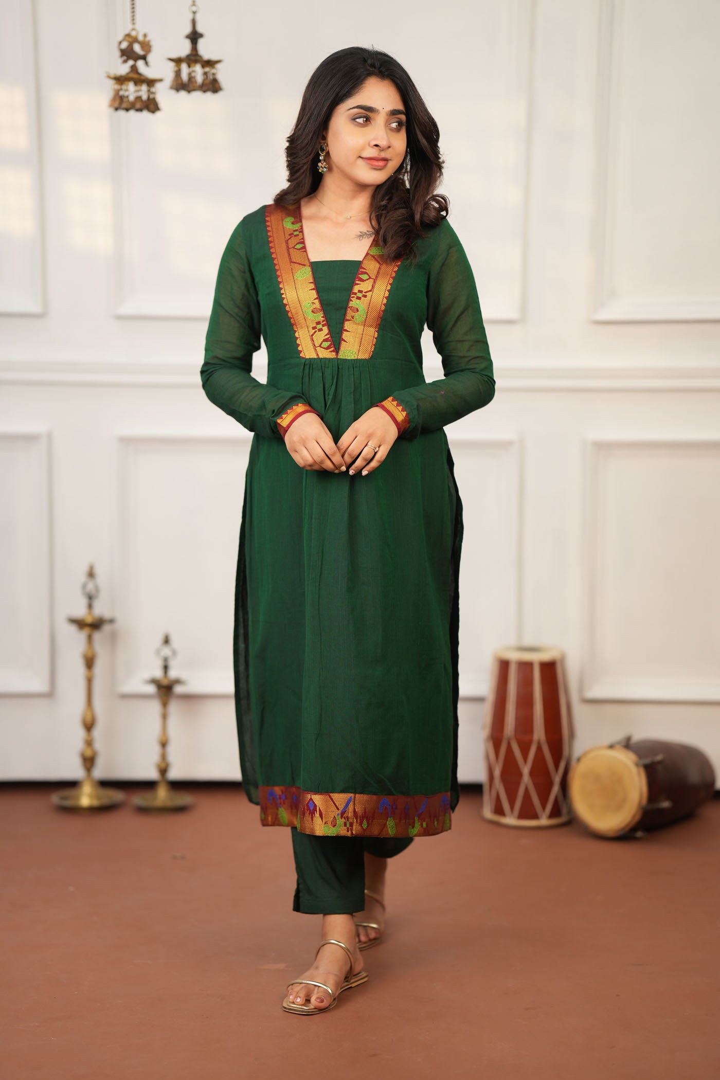 The Brindha Deep Green Kurta Set blends heritage handloom with modern festive elegance. Crafted in authentic Narayanpet cotton and paired with a silk-blend dupatta adorned in Banarasi zari borders, this straight-fit pleated kurta with a square V-neckline captures timeless charm. Lightweight yet luxurious, it’s perfect for temple visits, festive gatherings, and traditional celebrations.