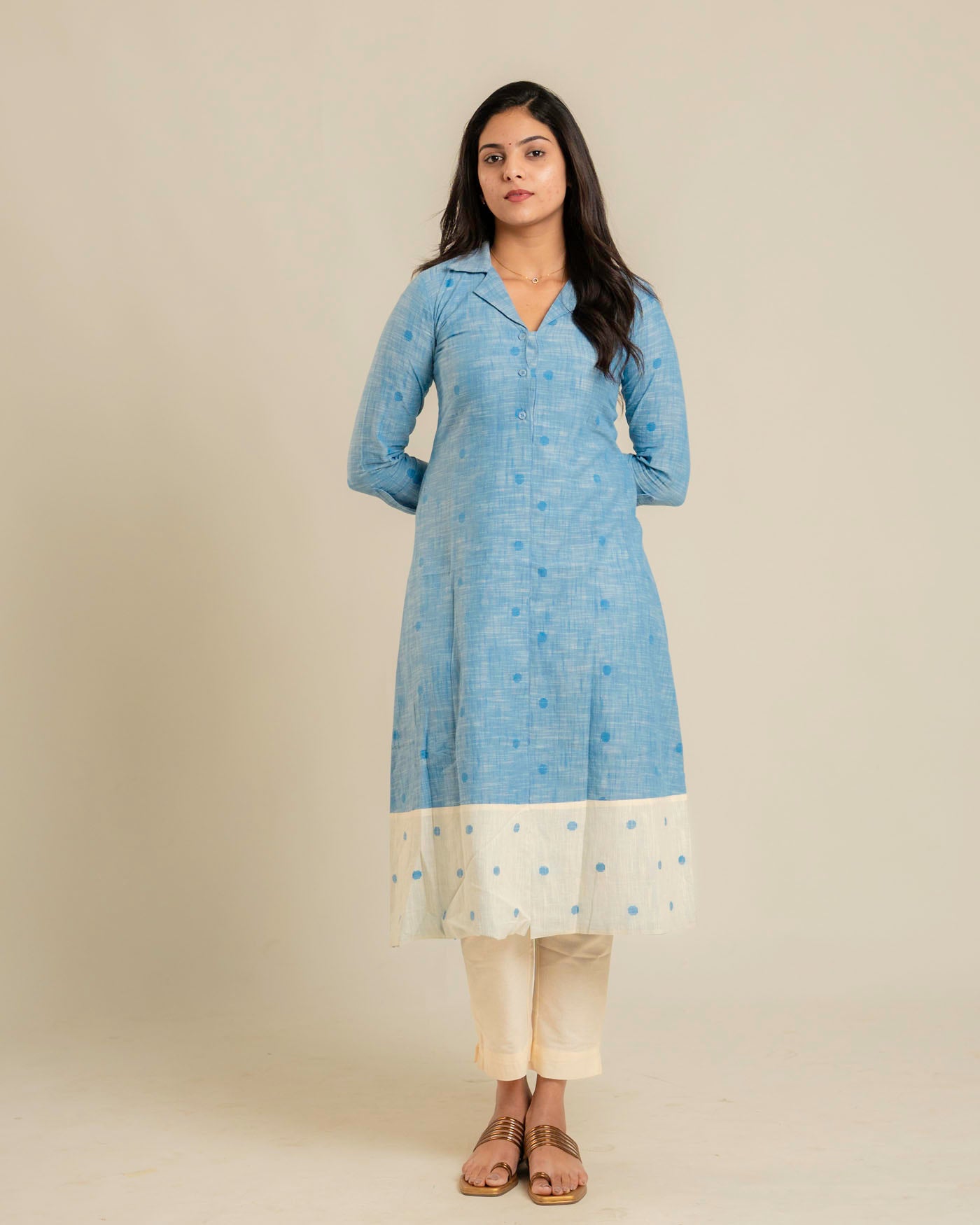Step into effortless elegance with the Creamy Blue Handloom A-Line Kurta, a perfect blend of subtle sophistication and playful charm. Handcrafted in breathable cotton, the creamy base is uplifted with delicate sky-blue polka dots, while the contrast yoke with button detailing adds structure and modern appeal. The A-line silhouette and elbow sleeves make it versatile for office wear, casual outings, and everyday chic. Simple yet striking, this kurta brings freshness to your summer wardrobe.