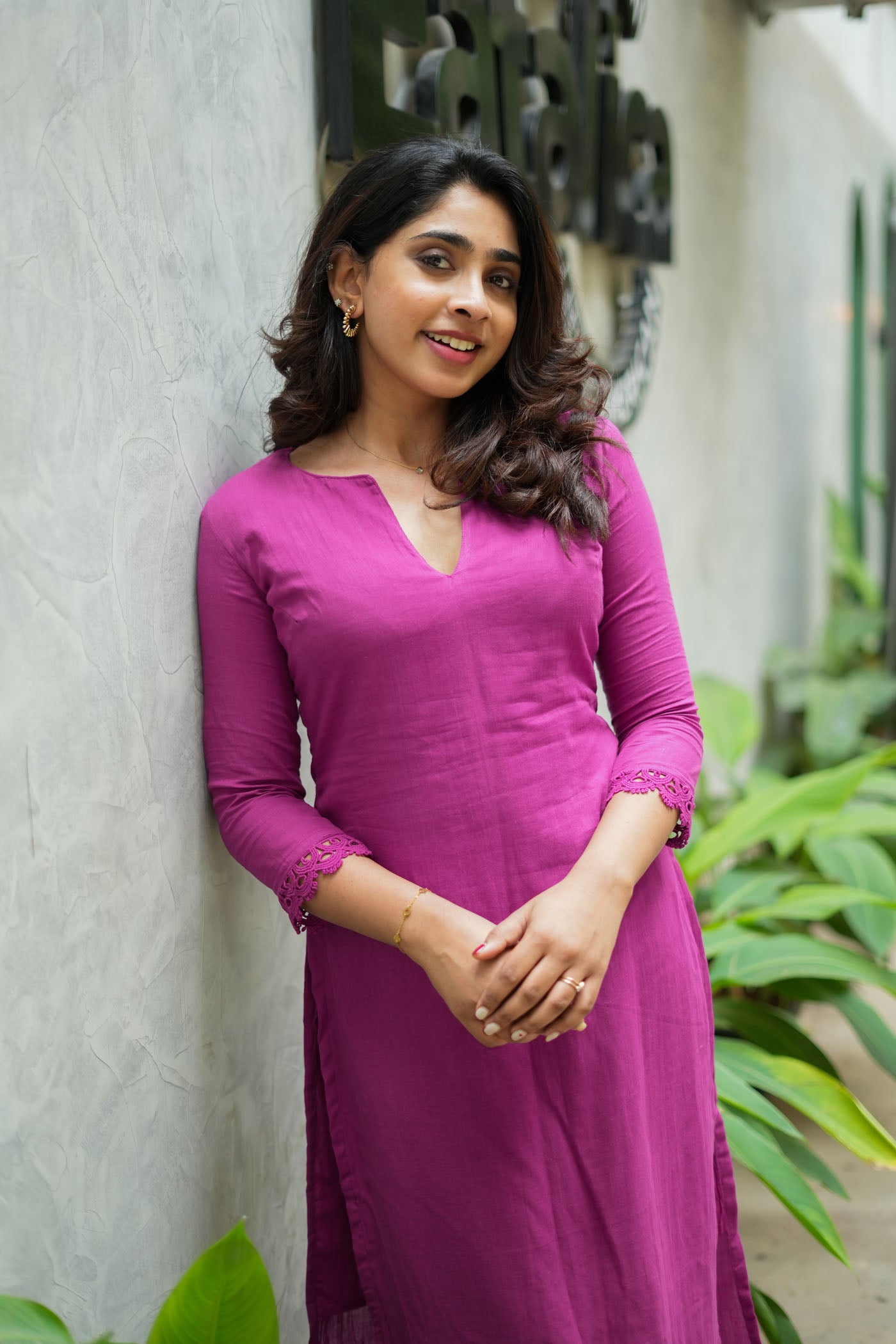 The Umaiyaal Magenta Kurti Set is tailored from premium dyed cotton, designed for effortless elegance with all-day comfort. The kurta features a straight-fit cut with a round V-neckline, three-quarter sleeves, and delicate lace trims on the hemline. Paired with slim-fit pants edged in lace cuffs, this set creates a refined, polished look ideal for office wear, meetings, and semi-formal gatherings. The rich magenta hue adds a vibrant charm while the minimal detailing ensures versatile styling – dress it up with statement earrings or keep it understated for a classic everyday outfit.
