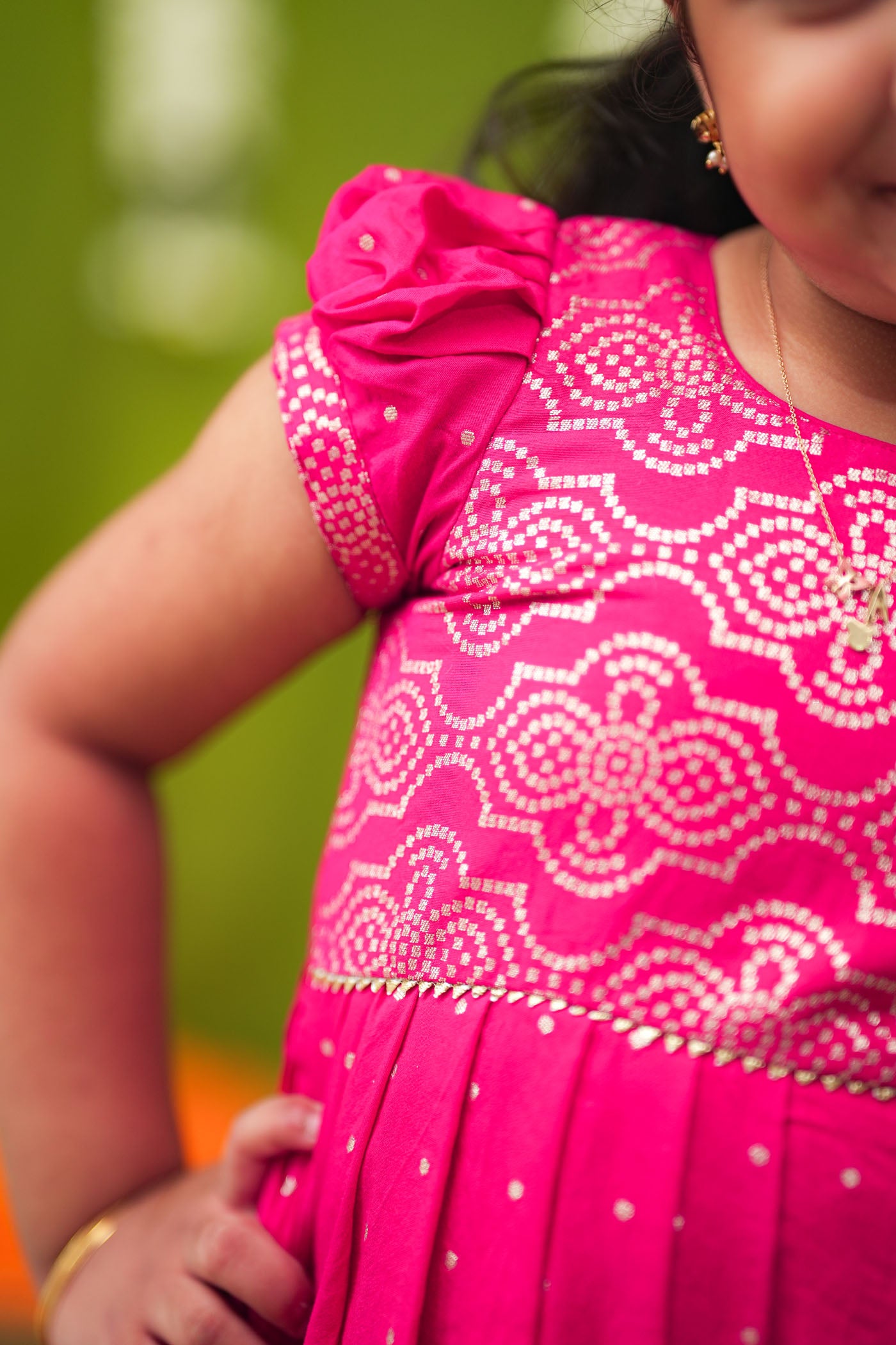 The Pravya Pink Frock Mini brings together festive charm and comfort in one adorable outfit. Made from a Chanderi silk blend, this frock is highlighted with zari buttis and dotted motifs, while the puff-sleeve yoke with traditional printed detailing adds a touch of cultural elegance. With its pleated flare and breathable cotton lining, this frock is designed for joyful spins at weddings, pujas, or festive get-togethers—keeping your little one comfortable and stylish all day.