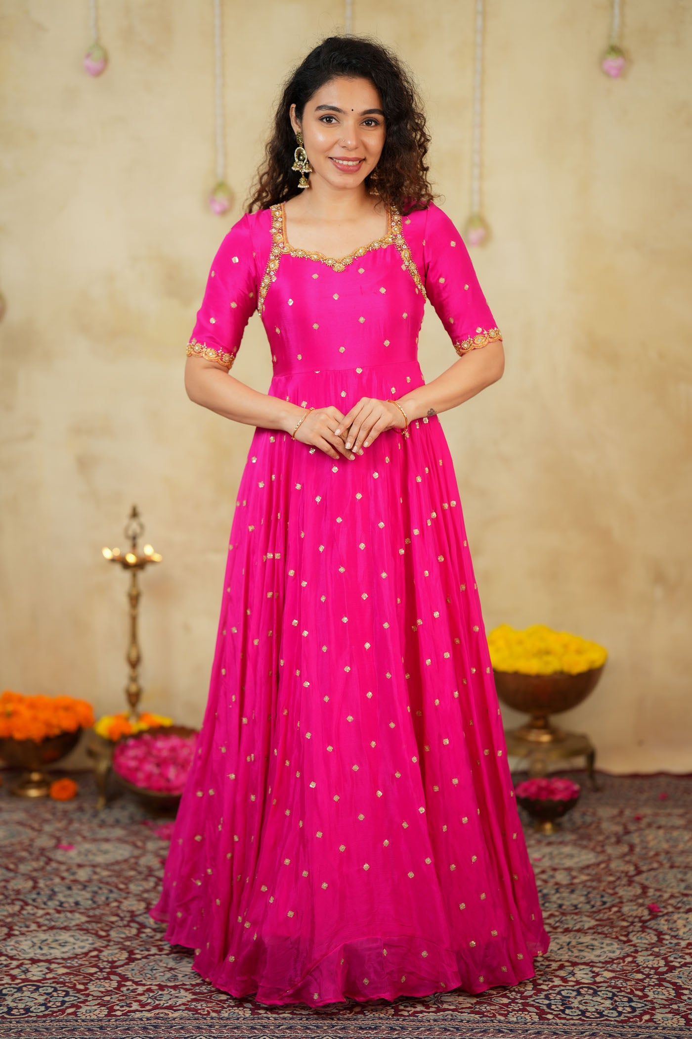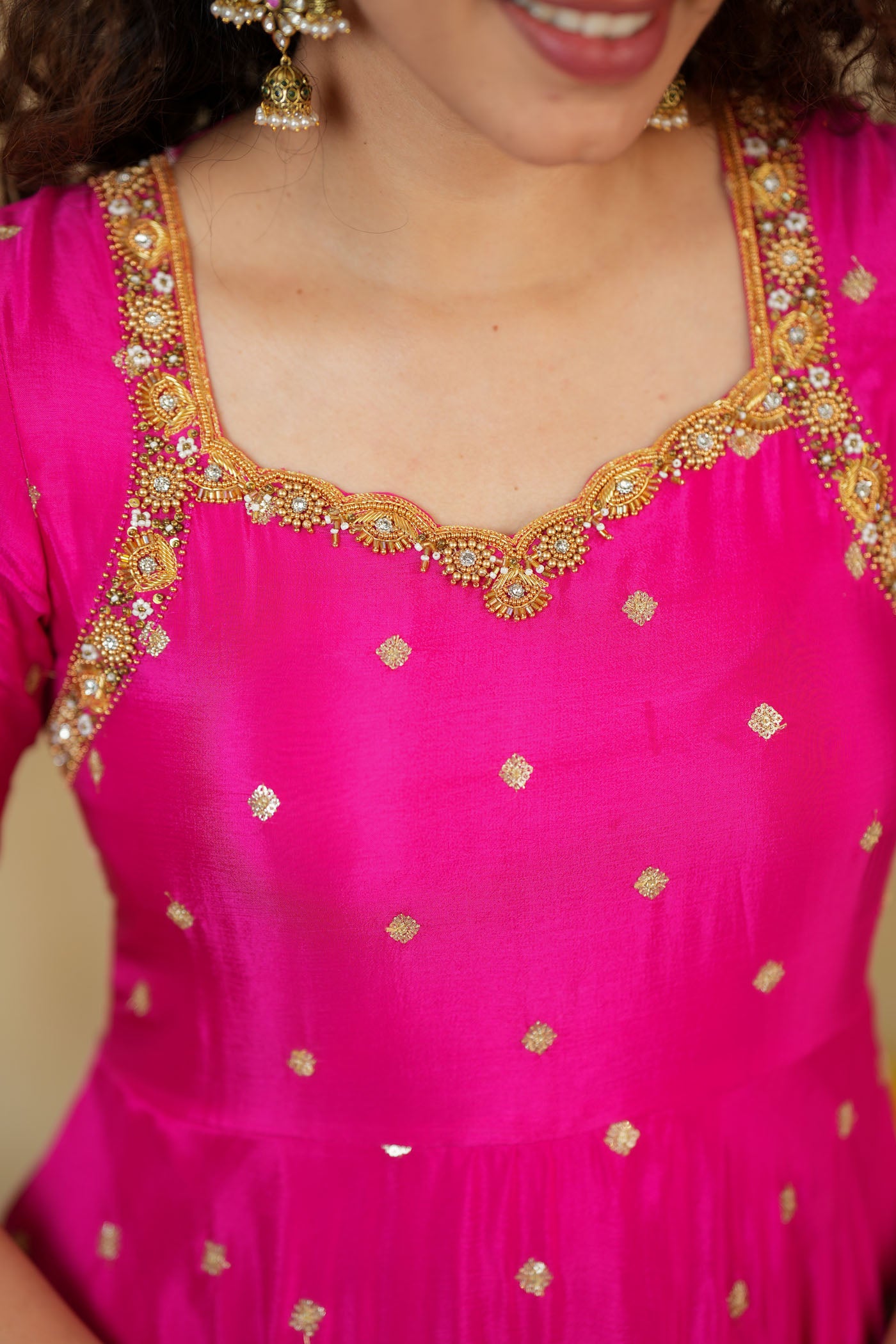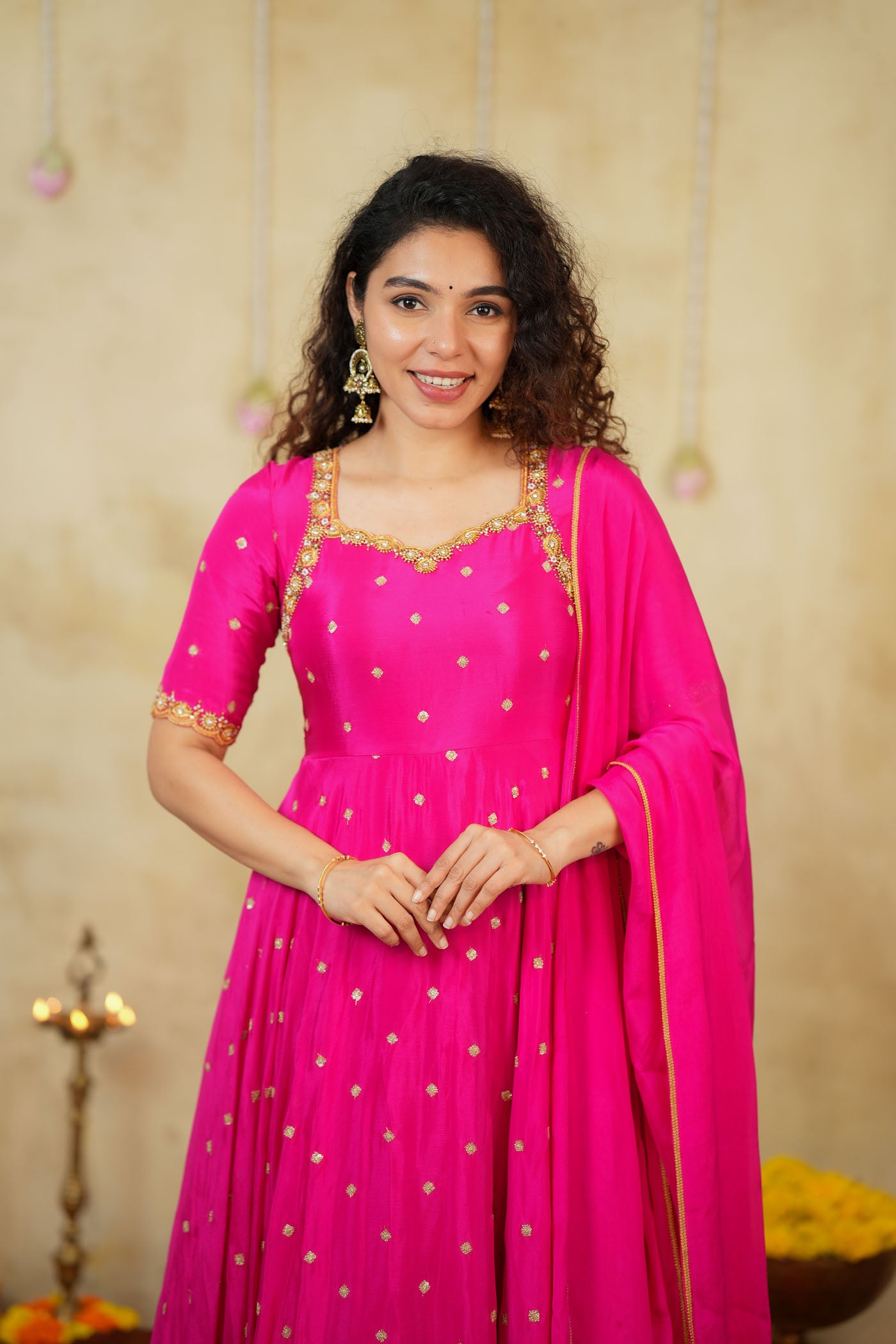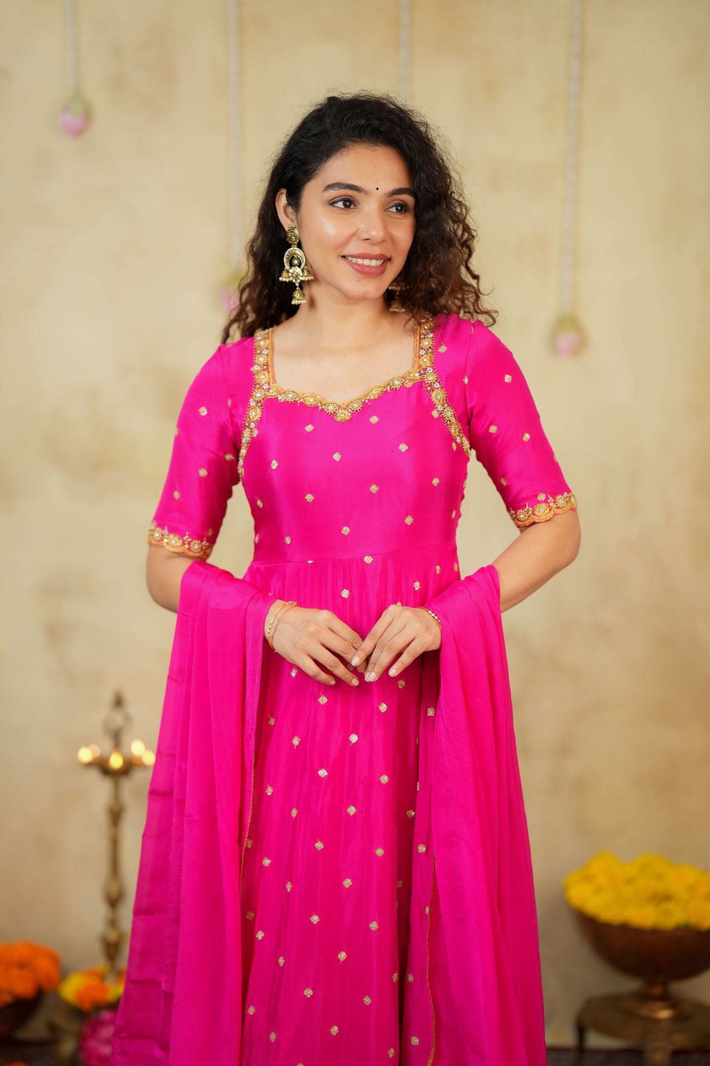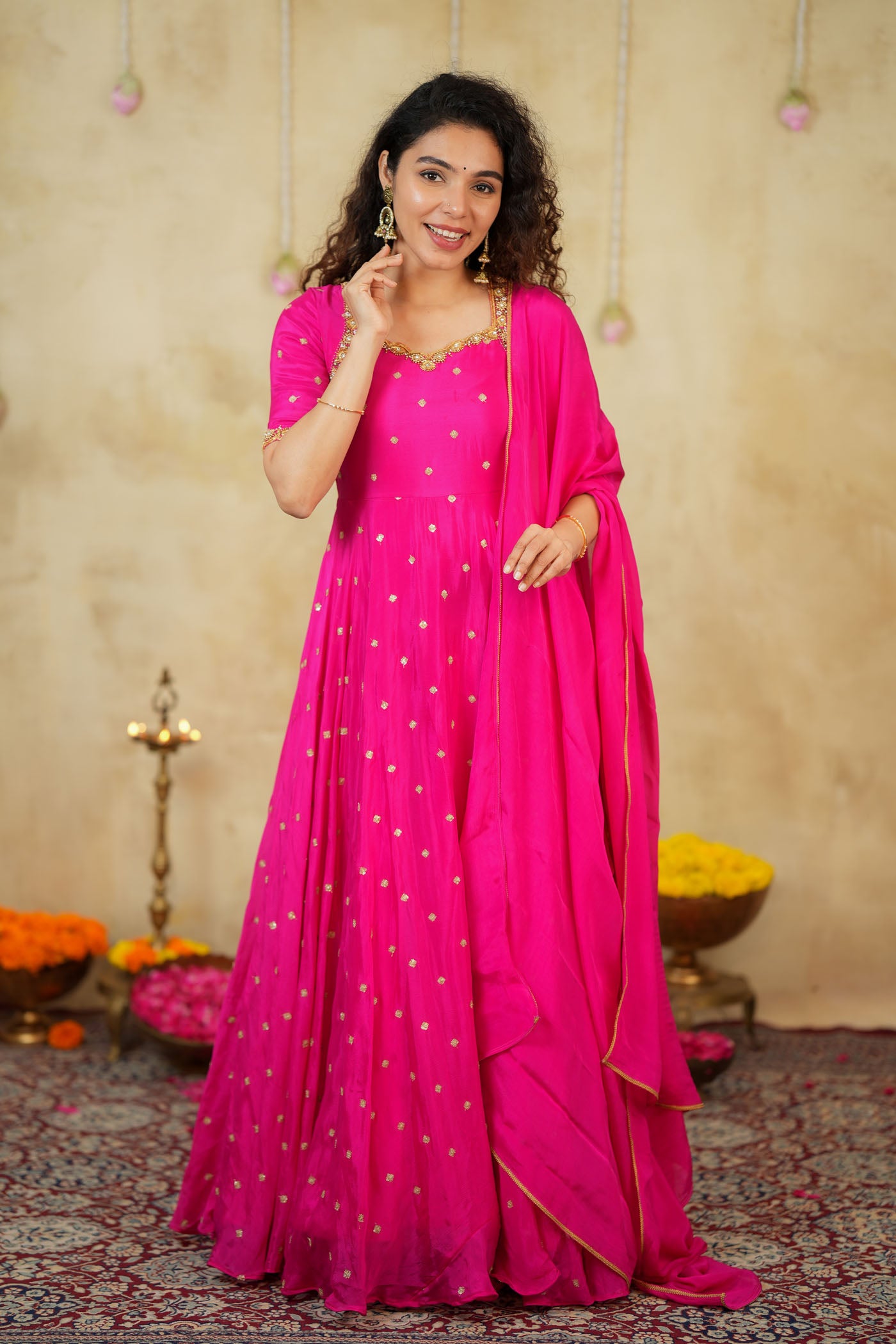 The Yamuna Rani Pink Maxi Set is a vision of radiance and tradition, crafted for women who love statement festive wear. Made from luxurious Chinon silk, this floor-length Anarkali comes alive with scattered golden zari buttis and intricate Aari embroidery along the sweetheart neckline and sleeves. Paired with a flowing dupatta in matching pink, the ensemble is designed for weddings, Diwali, Navratri, or reception evenings where elegance and vibrancy take centre stage.
