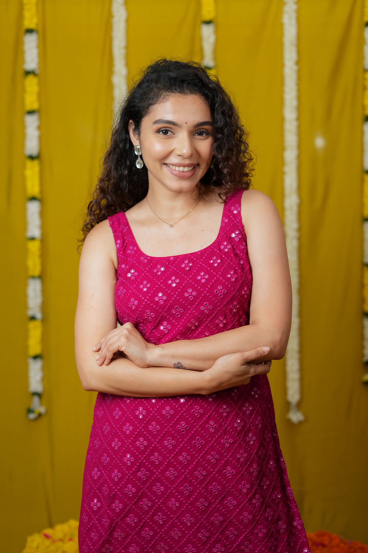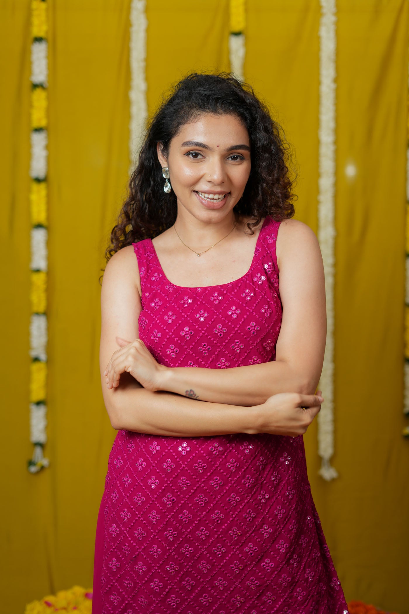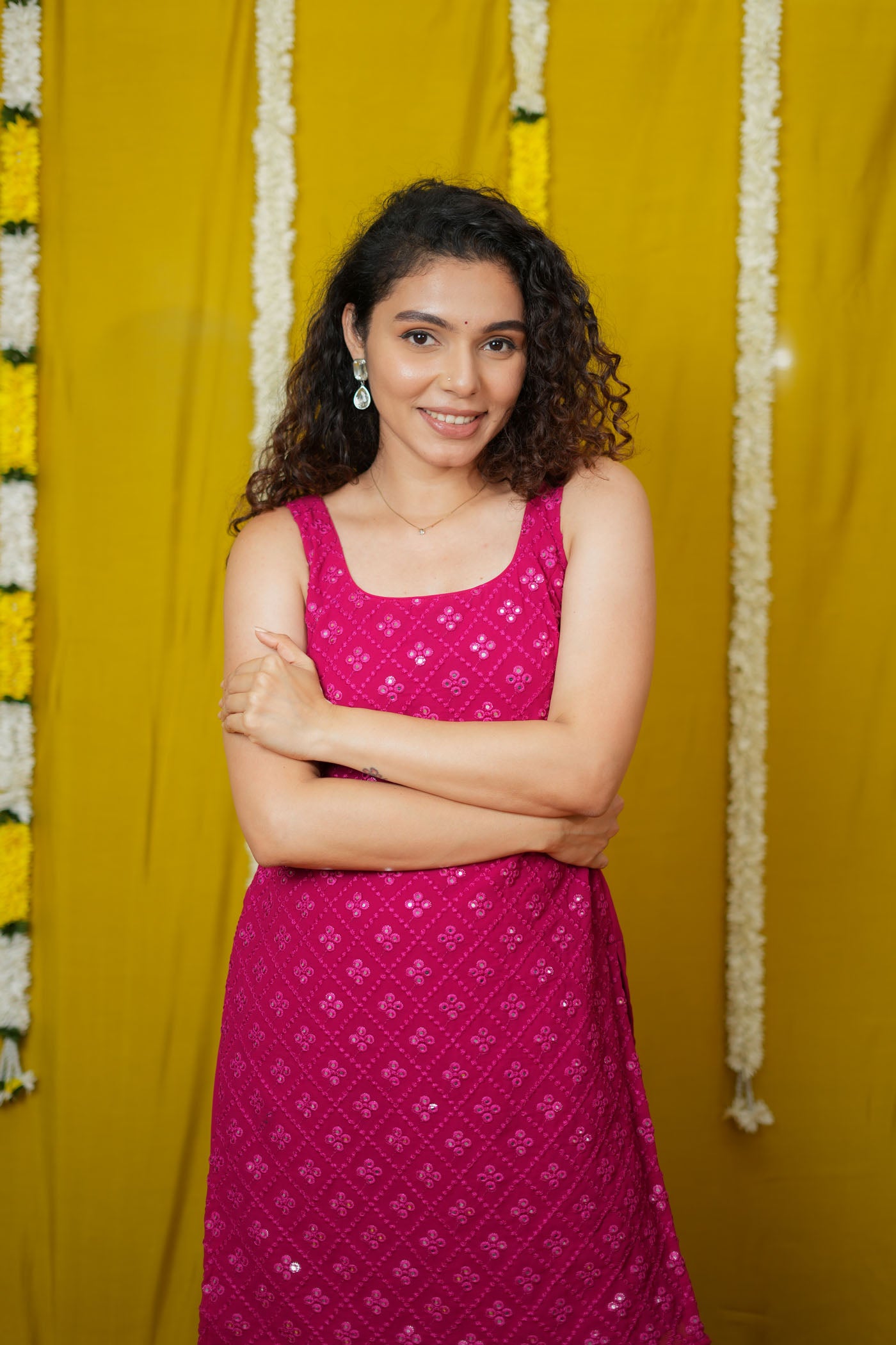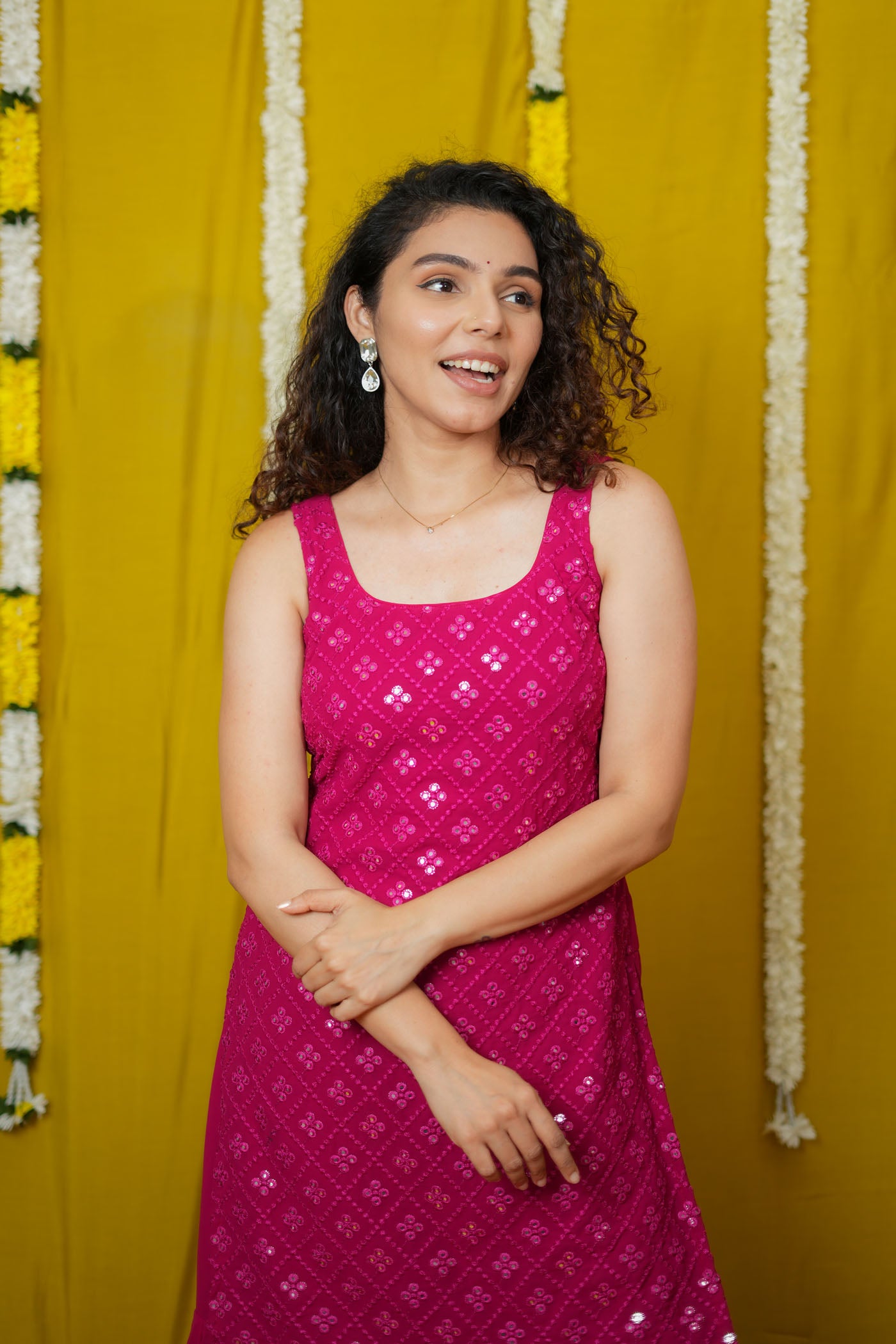 Turn every occasion into a statement with the Isai Rani Pink Sharara Set – a vibrant, sleeveless ensemble that blends festive glamour with breezy comfort. Crafted in soft georgette with intricate mirror work, this straight-fit kurta comes with flowing sharara pants and a matching dupatta. Lightweight yet striking, it’s the perfect choice for weddings, sangeet nights, and festive evenings.