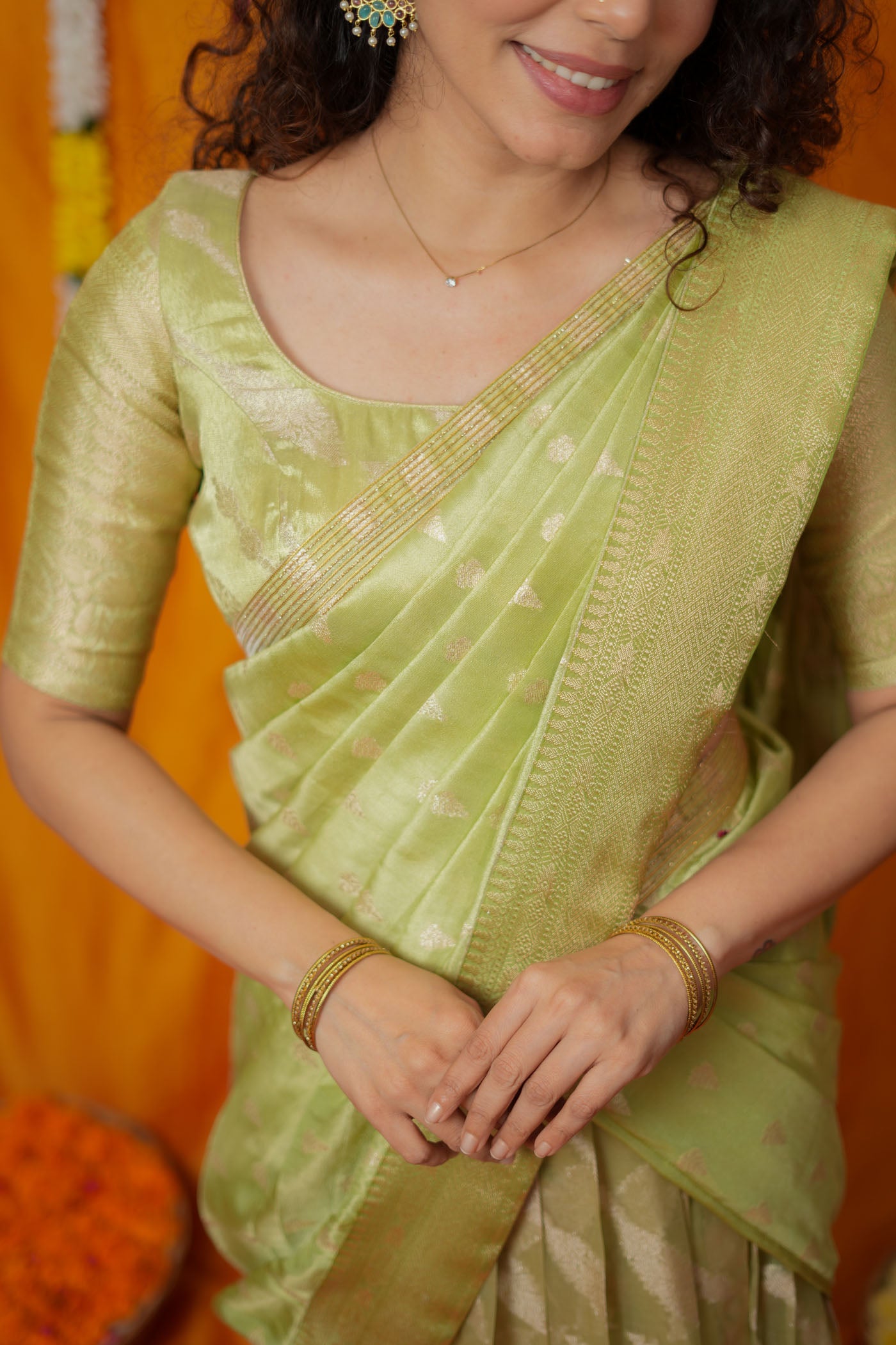 ✔ Woven zari work creates a soft gold glow without overpowering