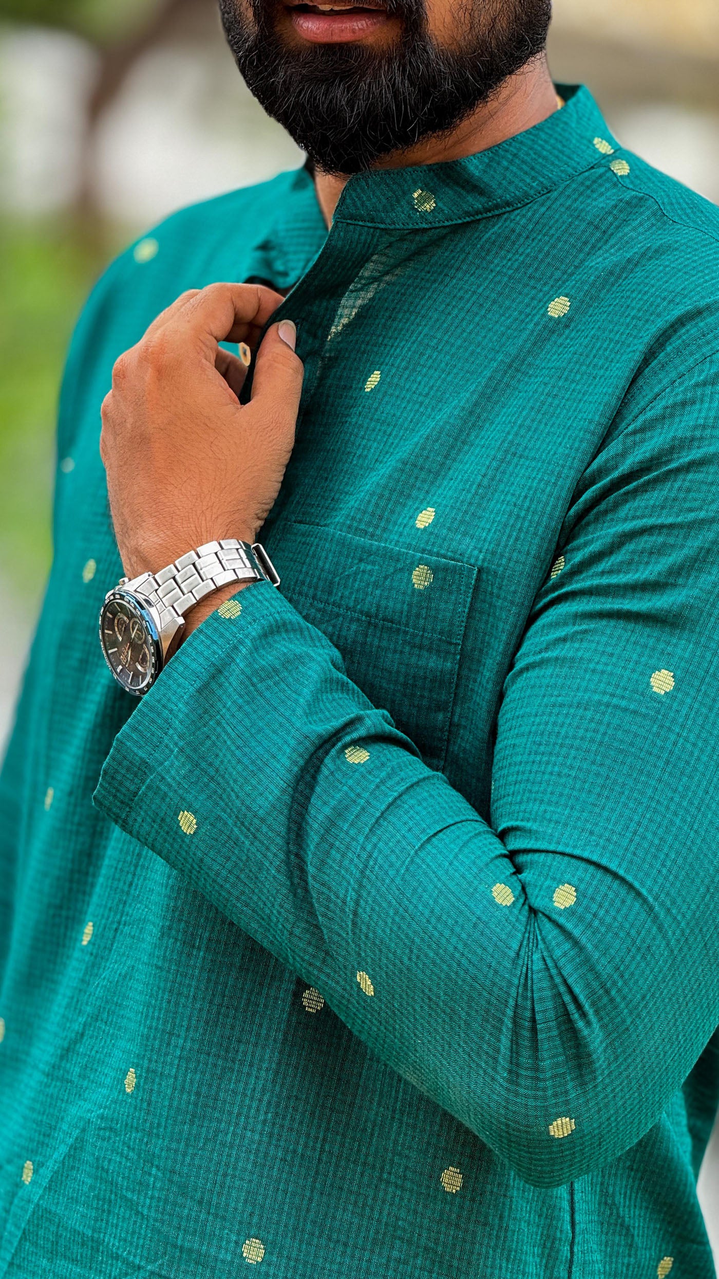 The Arsh Green Kurta embodies the timeless beauty of Indian craftsmanship, blending pure cotton gold lurex weave with a subtle sheen that elevates festive dressing. The rich green tone, accentuated with golden buttas woven across the fabric, exudes understated opulence — perfect for traditional ceremonies, temple visits, and cultural gatherings.