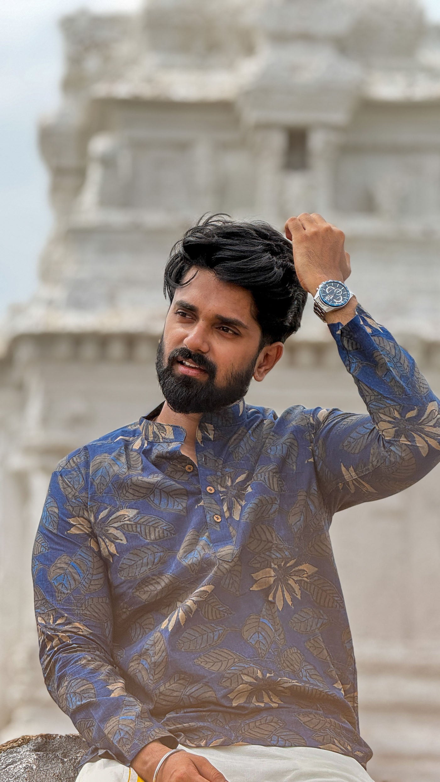 The Arsh Navy Blue Bagru Kurta is a celebration of timeless artistry, crafted in luxurious Tussar Silk with an intricate leaf-patterned Bagru print. This piece captures the balance between traditional hand-block design and modern sophistication. The rich navy tone with gold highlights reflects understated royalty — perfect for weddings, festive gatherings, and cultural occasions.