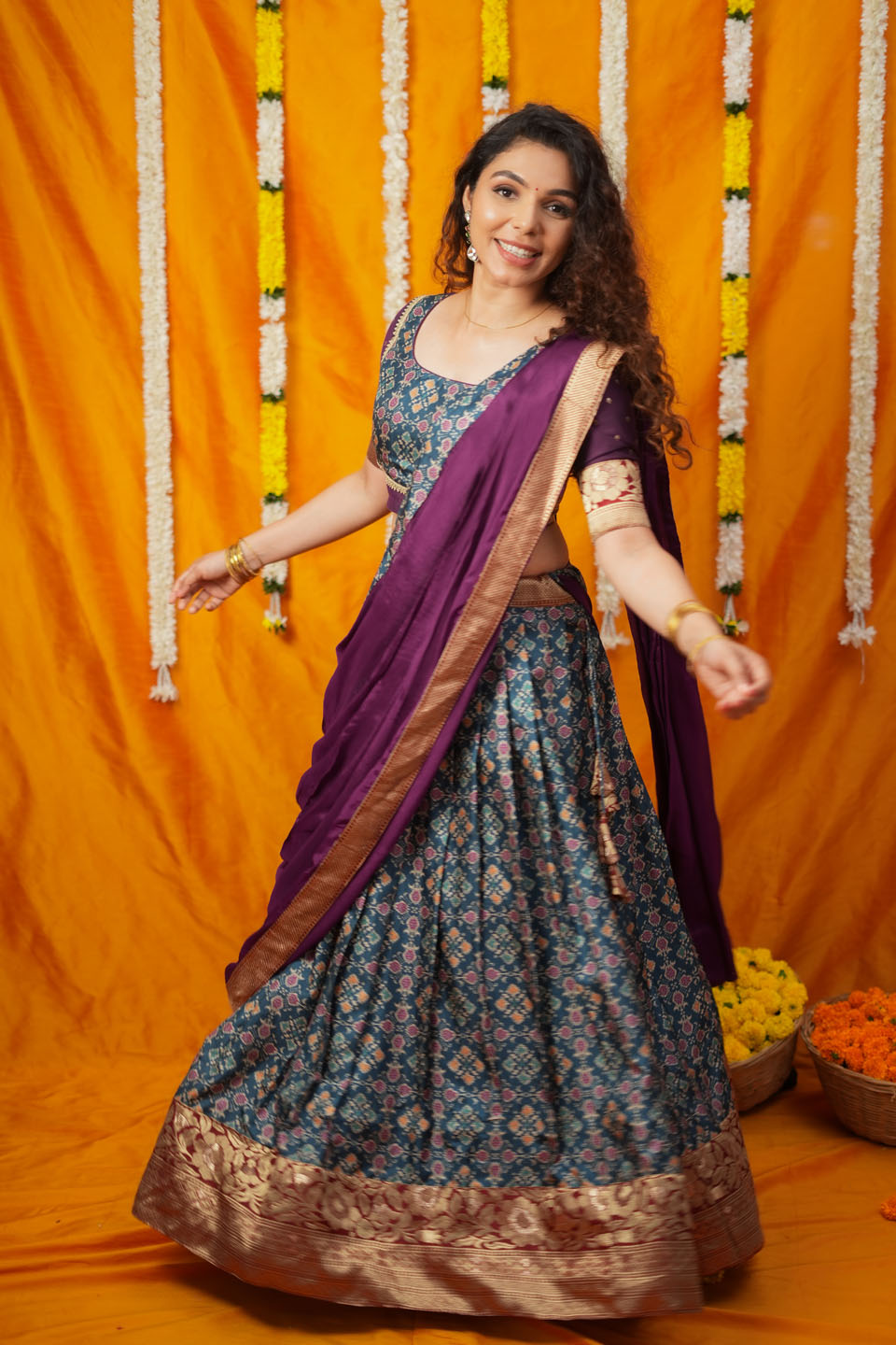 • Lehenga: Printed dola silk with heritage-inspired pochampalli motifs and broad Banarasi gold floral border