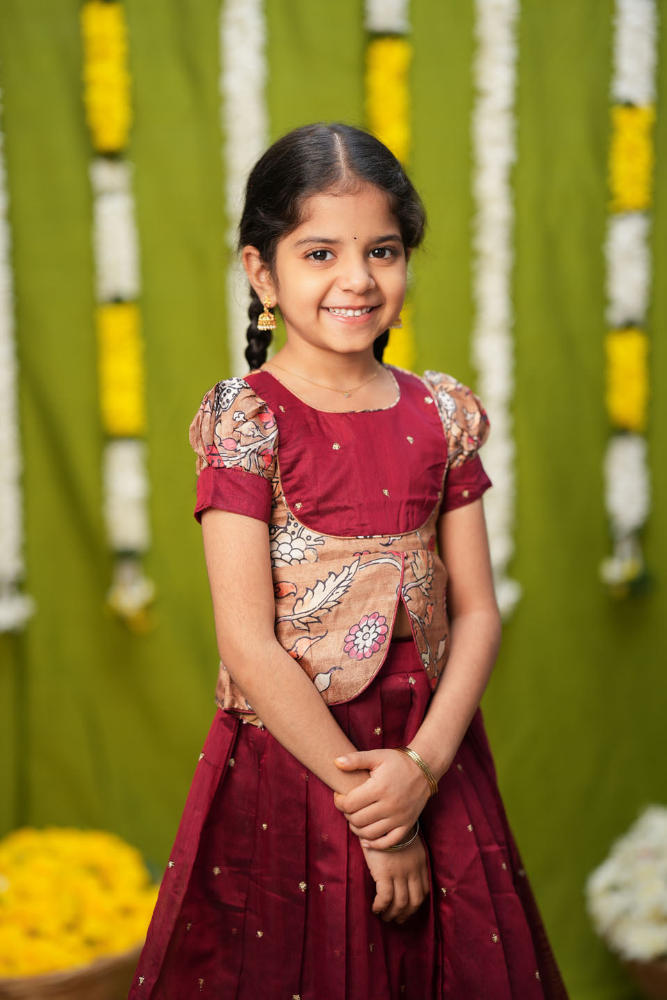 The Darshini Red Mom & Me Set is a stunning ode to Indian craft, woven with sequins, kalamkari artistry, and festive maroon hues. For moms, the Manaswini Maroon Lehenga Set brings saree-like grandeur in an effortless pre-stitched silhouette with a sequin-studded skirt, kalamkari-inspired floral blouse, and matching dhavani. For daughters, the Darshini Red Peplum Set mirrors the same artistry with a maroon chanderi skirt and a layered kalamkari jacket blouse—charming, playful, and made for twirls.