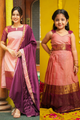 Momβs elegant navy checks kurti and flowing magenta dupatta perfectly complement the little oneβs heritage navy lehenga set with temple-inspired hemline, creating a look that feels rooted in South Indian culture yet joyful and modern.
