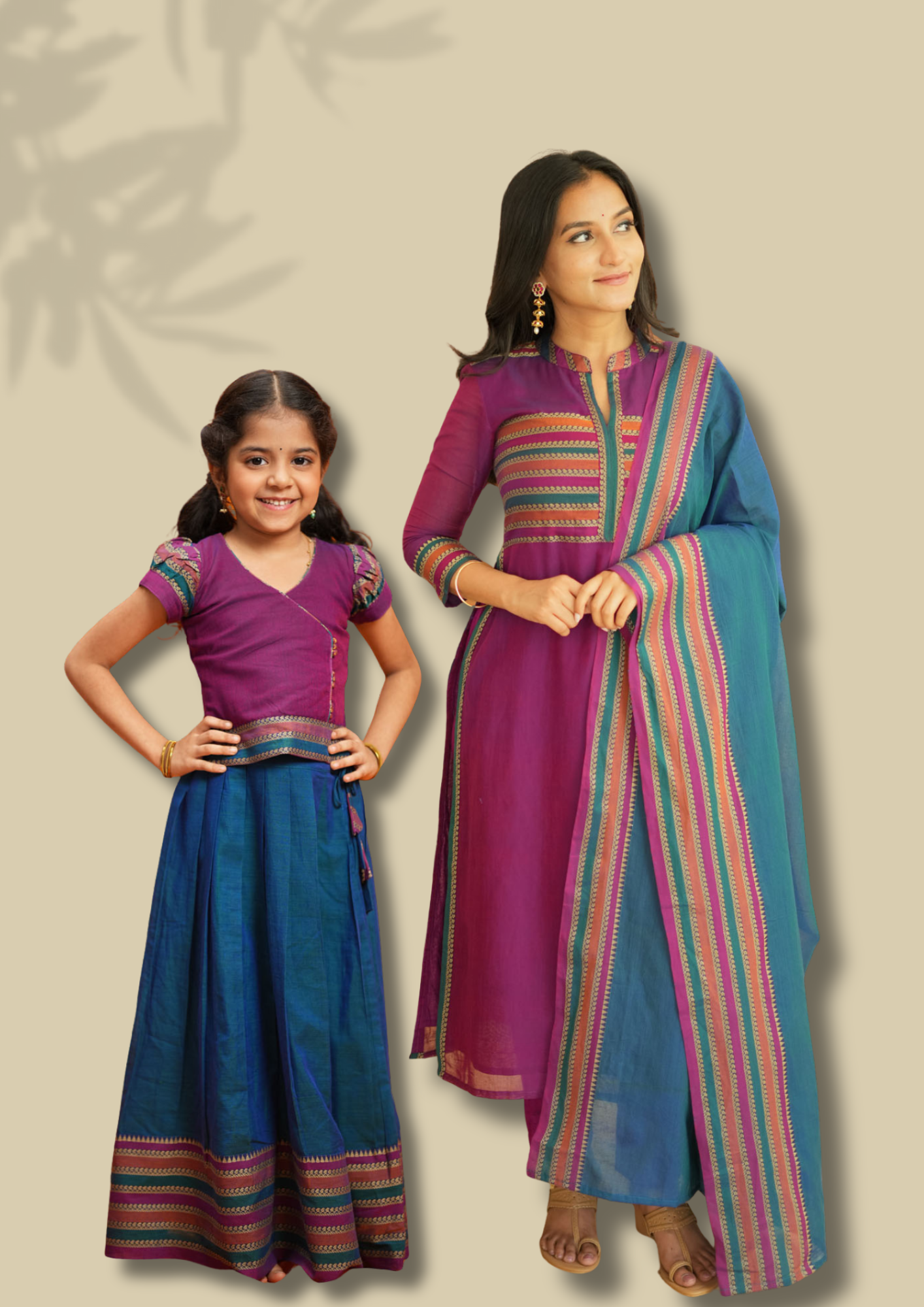 The Vanika Magenta with Teal Mom & Me Set is more than matching attire — it’s a celebration of lineage, legacy, and the joy of dressing up side-by-side. Crafted in authentic Narayanpet handloom cotton, this coordinated duo weaves together rich festive hues, traditional patterns, and breathable comfort — perfect for vibrant temple mornings, festive evenings, and every “let’s click a photo!” moment in between.