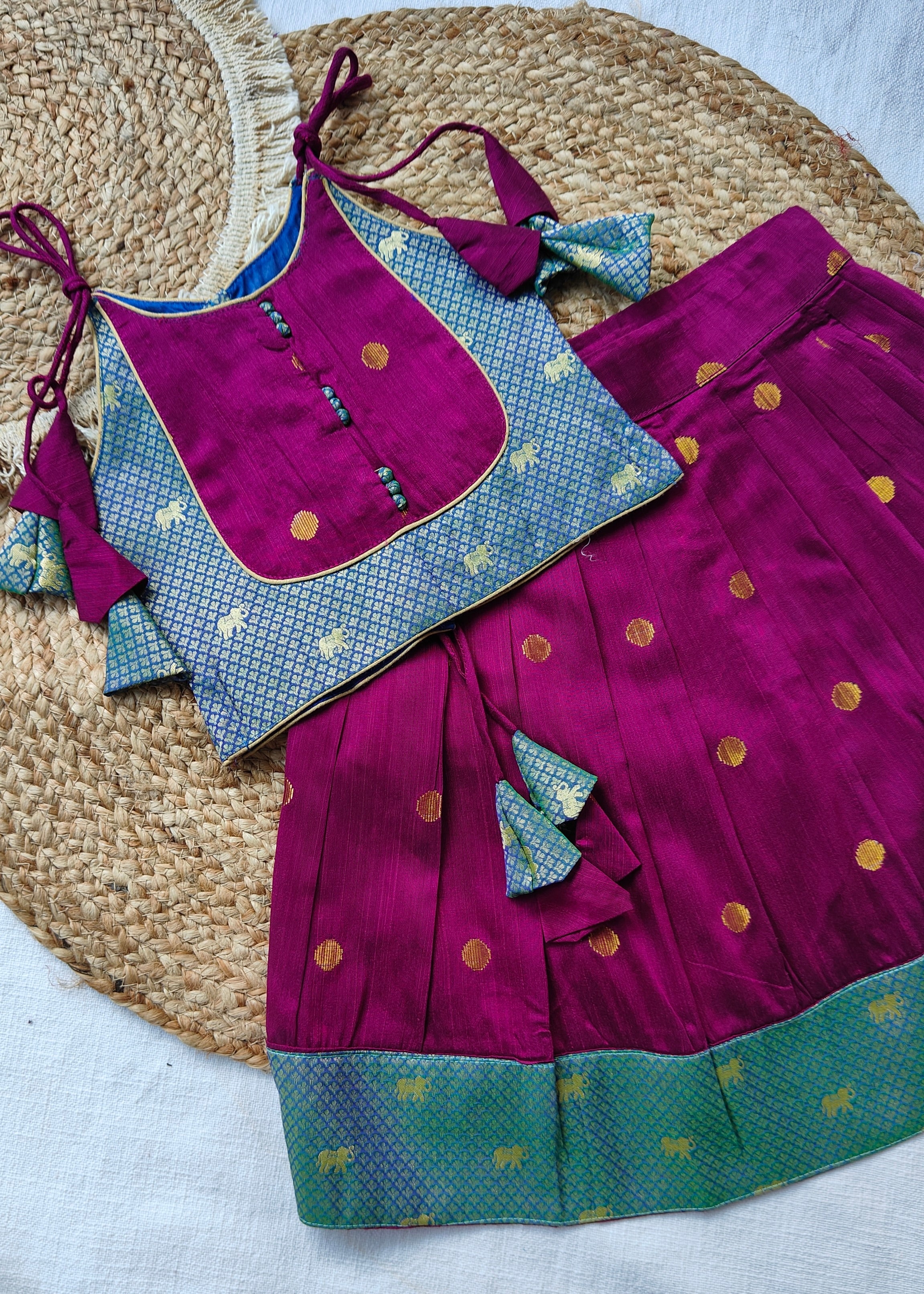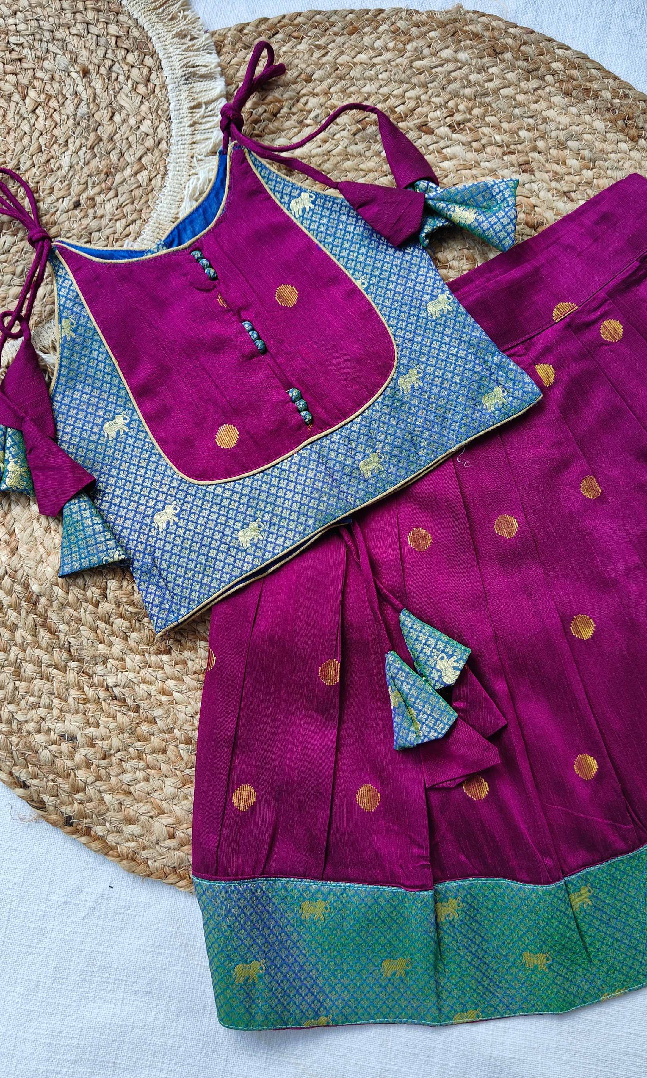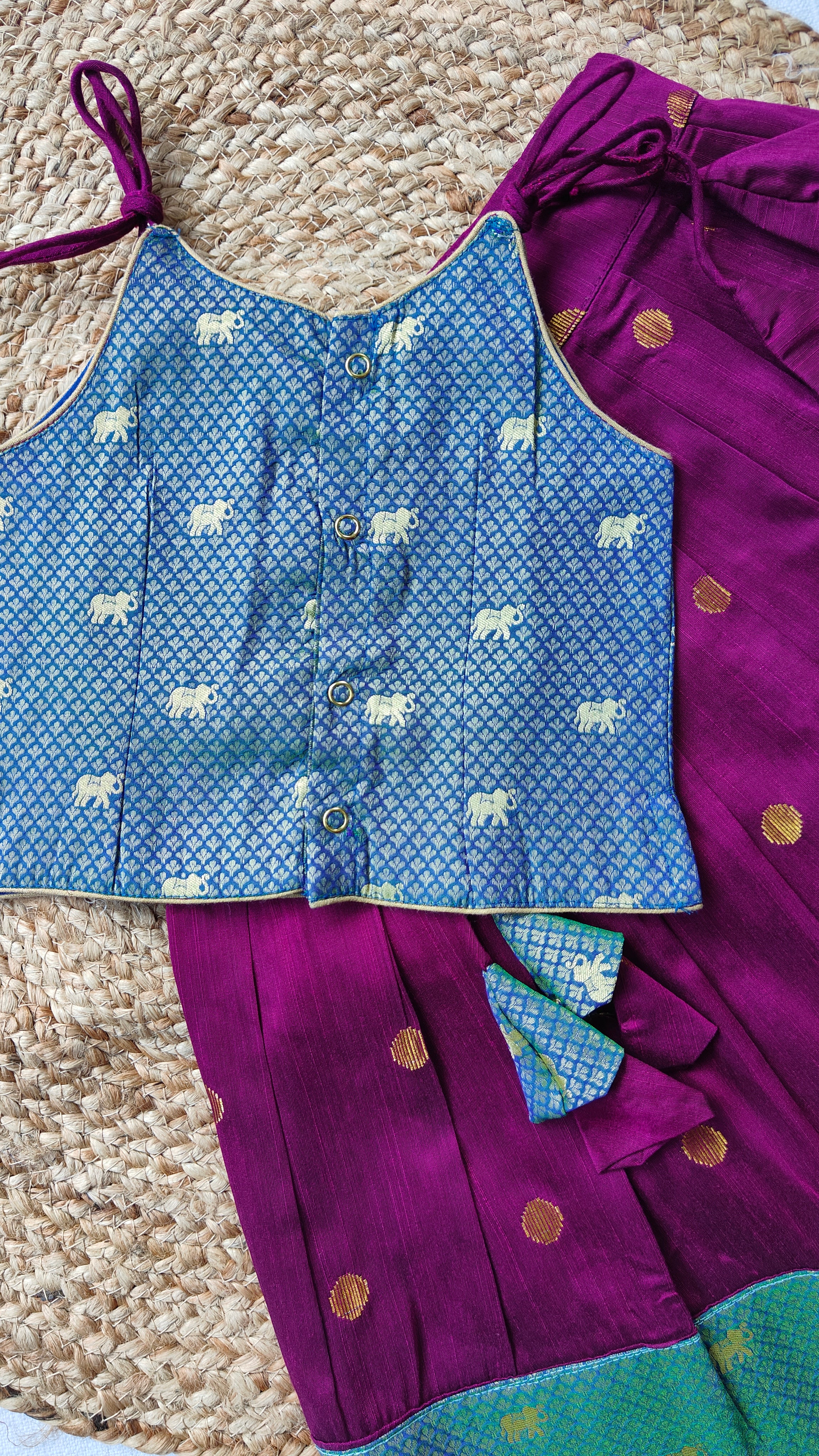 Let your little one shine with regal charm in the Anusha Magenta & Blue Mini, a handcrafted ensemble that blends playful elegance with timeless Banarasi artistry. Featuring a magenta pleated skirt adorned with golden polka dots and a contrast brocade border, paired with a delicately woven blue Banarasi silk top highlighted with traditional elephant zari motifs — this two-piece set is a treasure trove of heritage and joy.