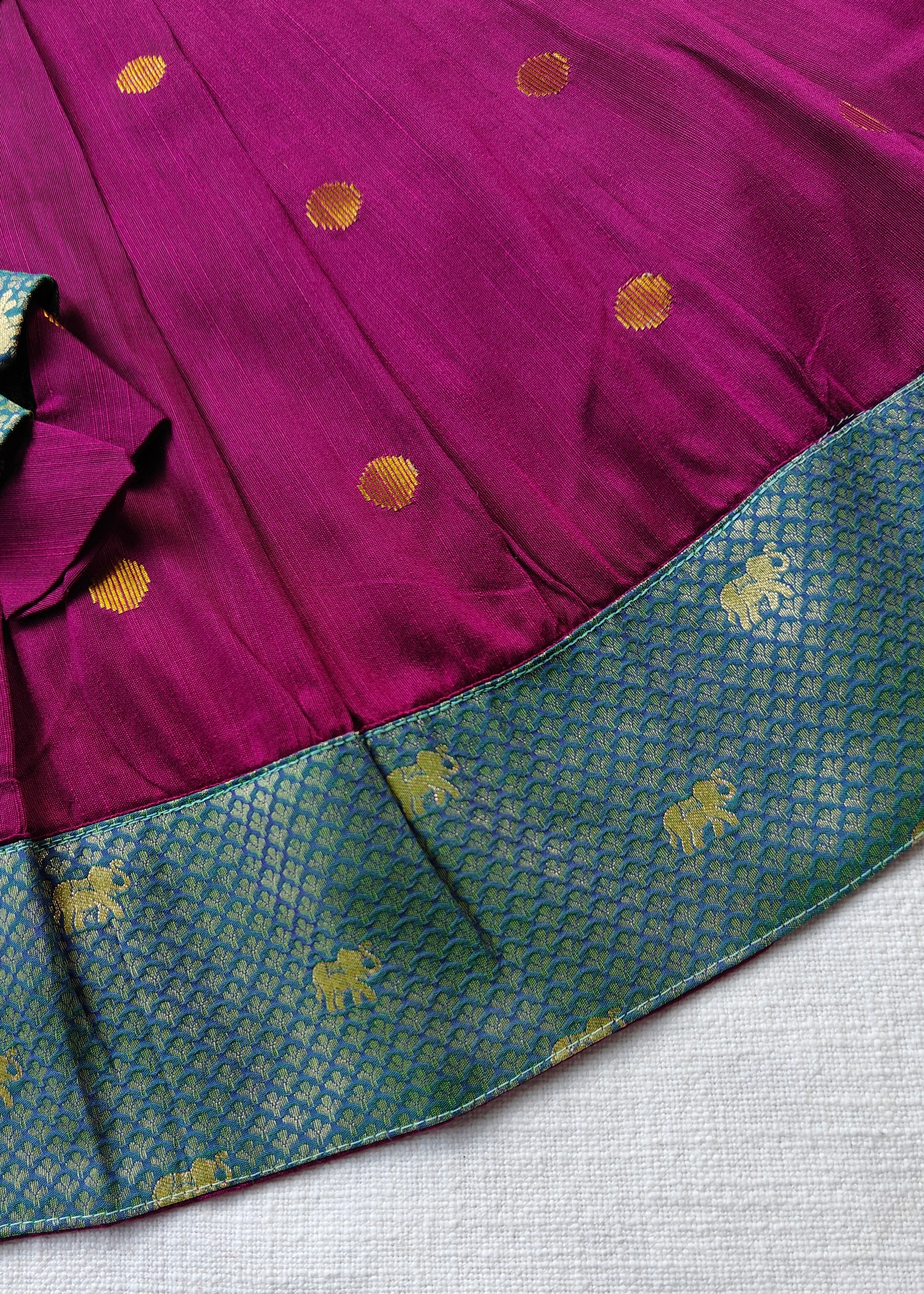 Skirt: Premium magenta Chanderi blend with golden woven dots and broad brocade border