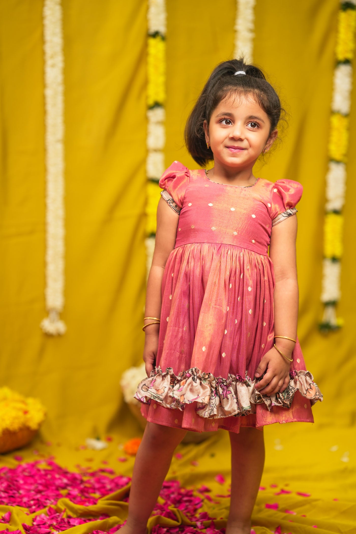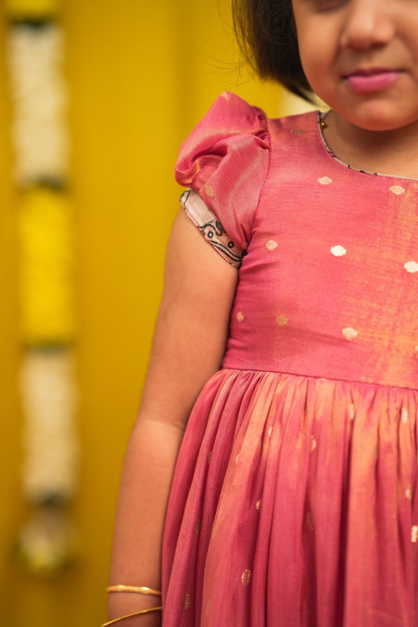 The Charita Rose Pink Frock Mini is an enchanting Indo-ethnic frock designed to capture every festive smile. Crafted in premium shimmer tissue georgette, it glimmers with zari-woven motifs across the bodice and flare. The frock is finished with a digitally printed kalamkari floral ruffle hem, adding a playful touch of heritage to its modern silhouette. With its puff sleeves, round neckline, and twirl-ready flare, this frock ensures your little one is both elegant and comfortable—whether at a birthday celebration, temple visit, or Diwali function.