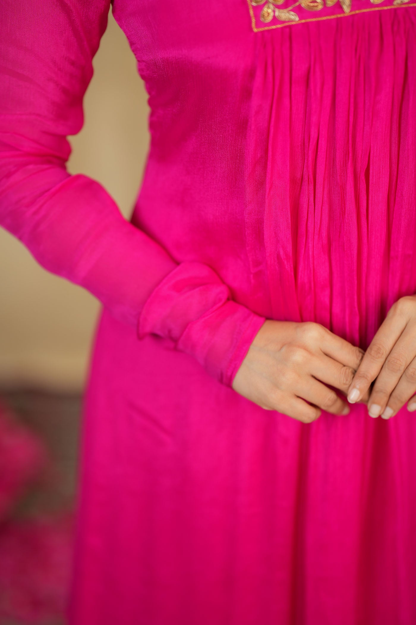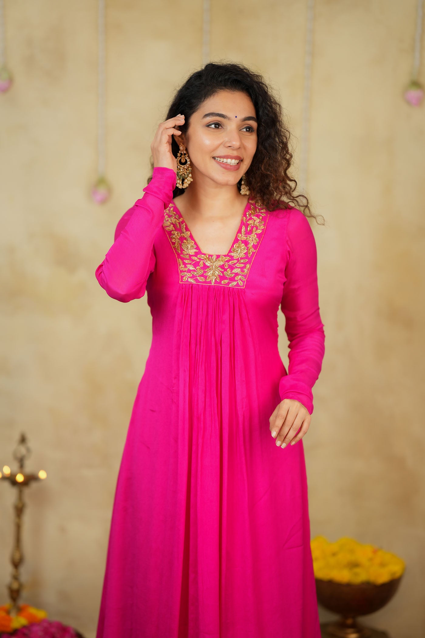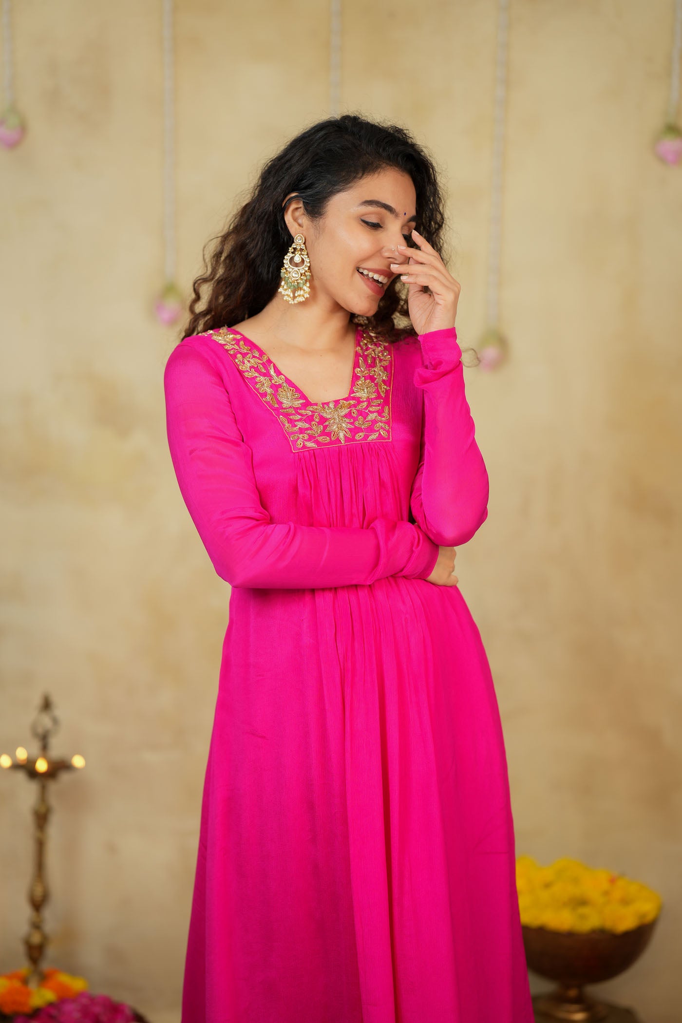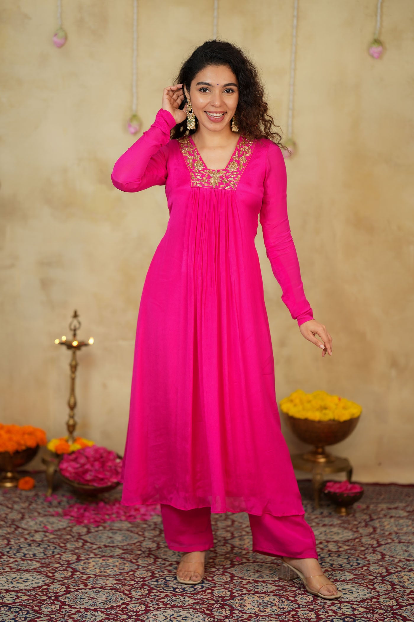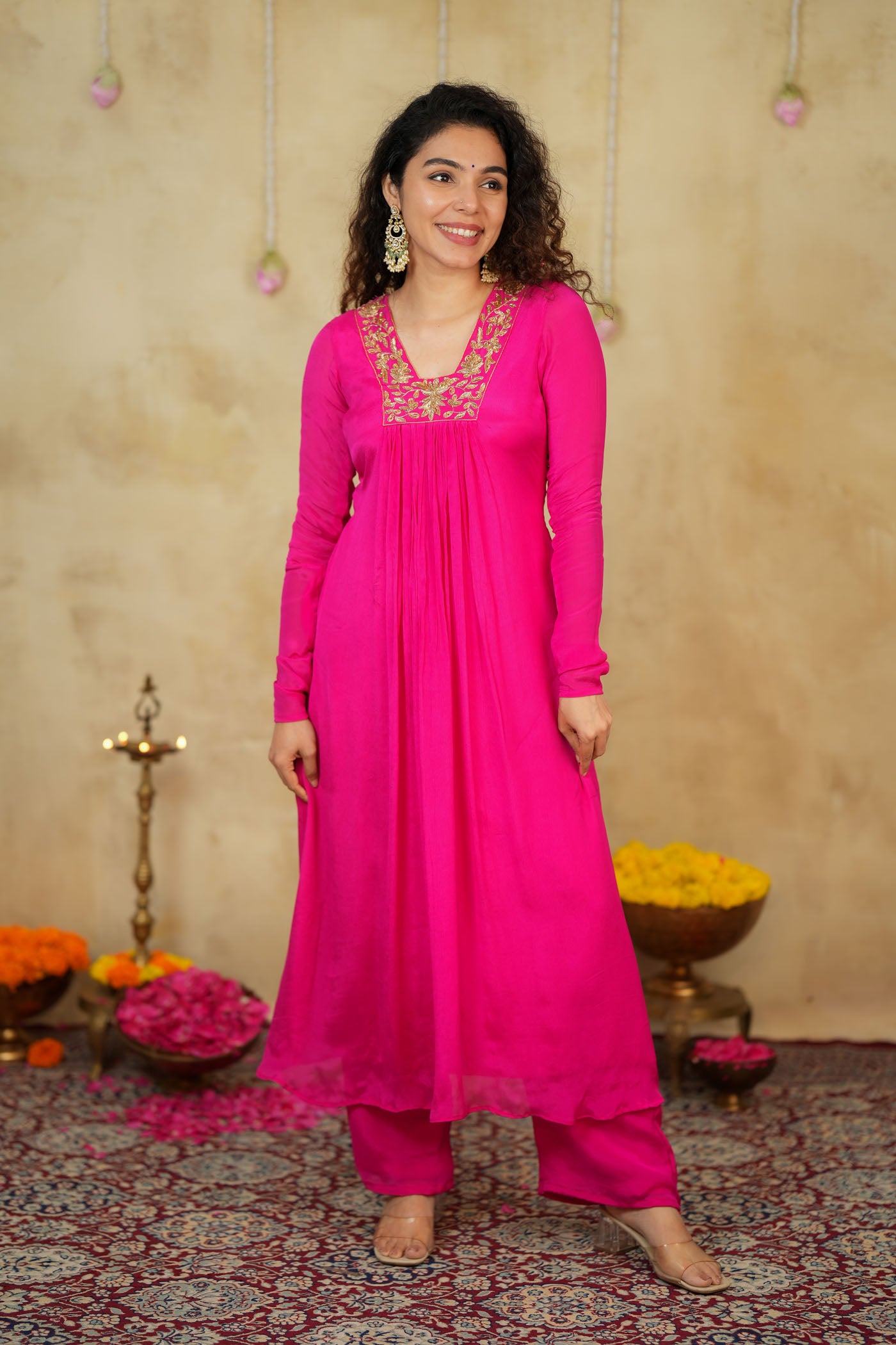 The Kiara Rani Pink Kurta Set is a radiant ensemble crafted for celebrations that call for elegance and vibrance. Made from luxurious Chinon silk, this A-line kurta is paired with comfortable palazzo pants for effortless movement. The square neckline is adorned with intricate handcrafted gold embroidery, creating a regal contrast against the vibrant rani pink. Lightweight yet statement-worthy, this set is perfect for Diwali nights, weddings, or festive evenings where tradition meets style.