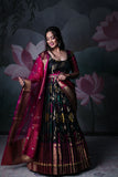 Step into the elegance of Nilambari Green, a full-length Indian women's dress crafted from authentic handwoven Narayanpet cotton. Designed to blend tradition with modern aesthetics, this maxi dress features a fitted bodice with a collared neckline, elbow-length sleeves, and a...