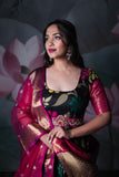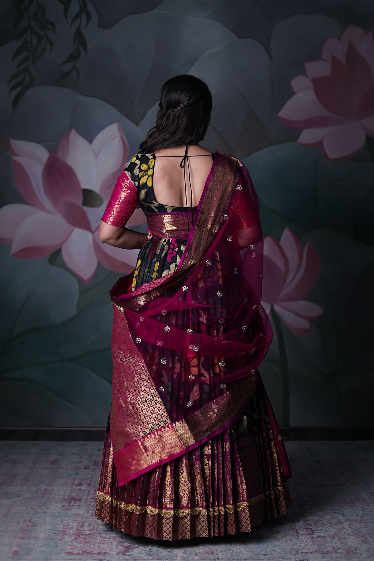 The Nilambari Magenta is a beautifully crafted floor-length maxi dress, combining a fitted bodice with a graceful flared skirt. Made from authentic handwoven Narayanpet cotton, this dress highlights traditional craftsmanship with intricate border detailing and minimalist pleating. Perfect for any...