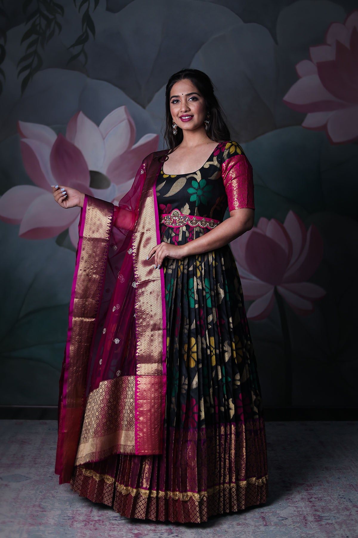 💖 Sahana Magenta Narayanpet Cotton Dress | Timeless Elegance in Handwoven Luxury Elevate your festive wardrobe with the Sahana Magenta Narayanpet Cotton Dress, a flared silhouette crafted in authentic Narayanpet cotton. This exquisite piece is adorned with premium Chanderi silk...