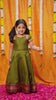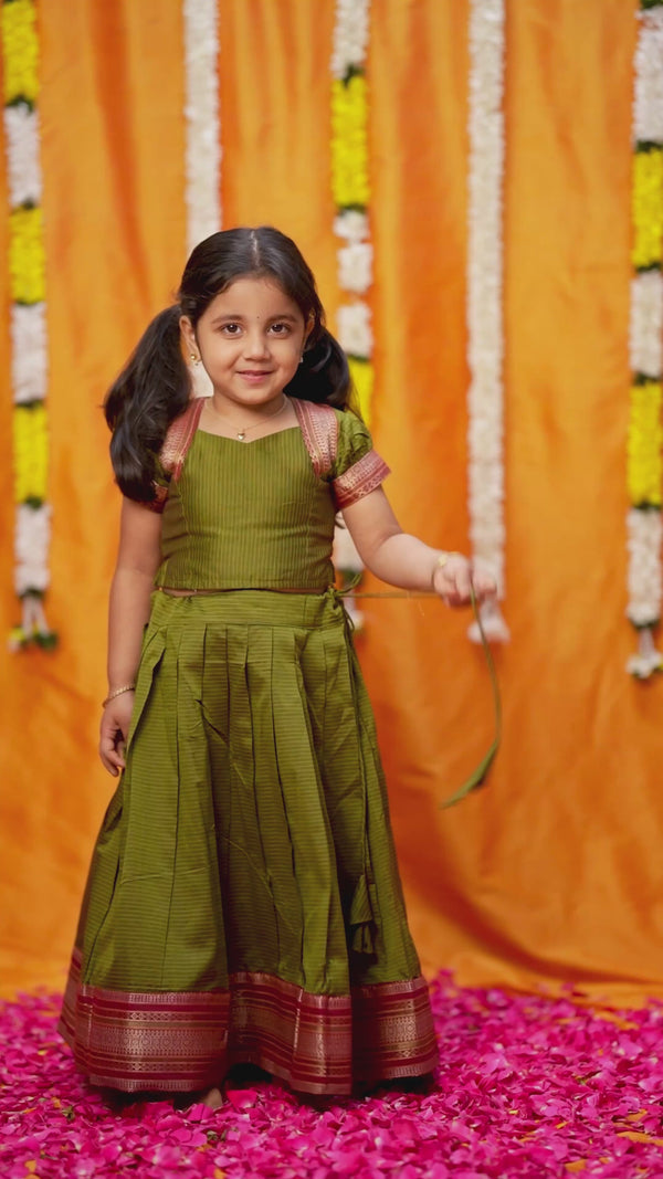 Traditional never looked this cheerful. Introducing the Abiradhi Green Handloom Top & Skirt Mini—a celebration of childhood wrapped in handloom finesse. Woven in a rich olive green cotton-silk blend, this ensemble features delicate gold zari stripes that shimmer under festive lights. With a sweetheart neckline, puff sleeves, and wide zari borders, it’s everything a proud celebration of heritage should feel like—light, regal, and joyfully twirl-worthy.