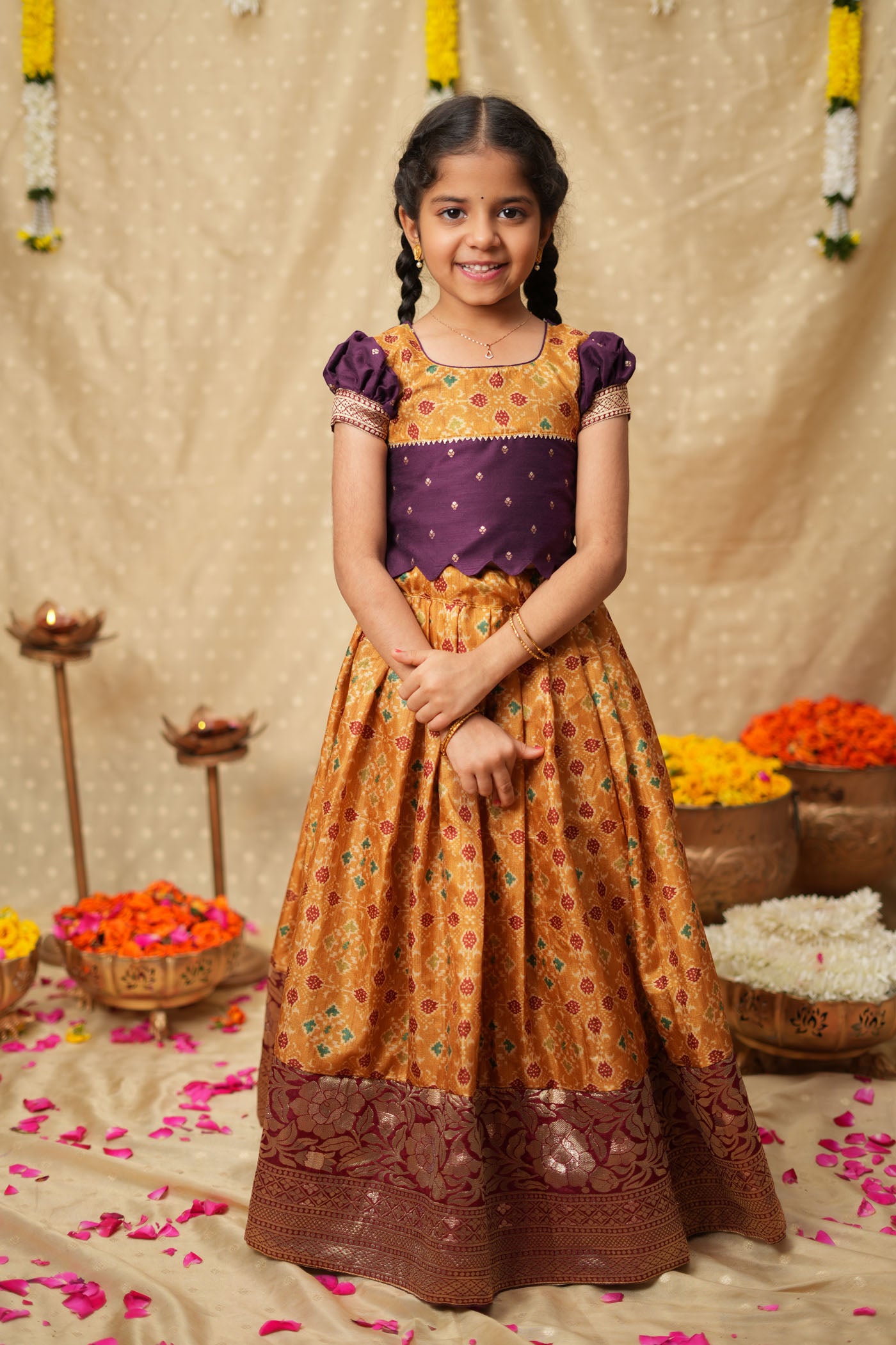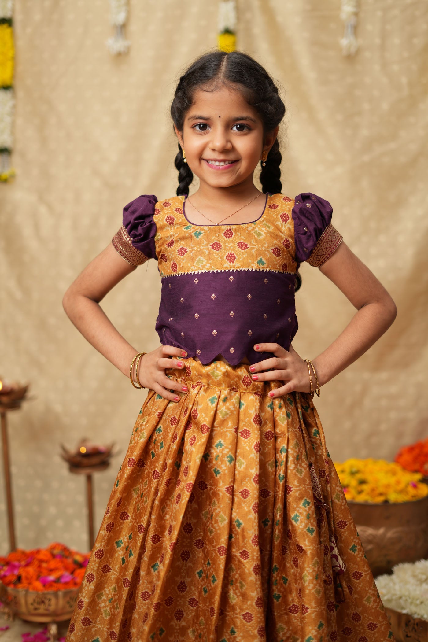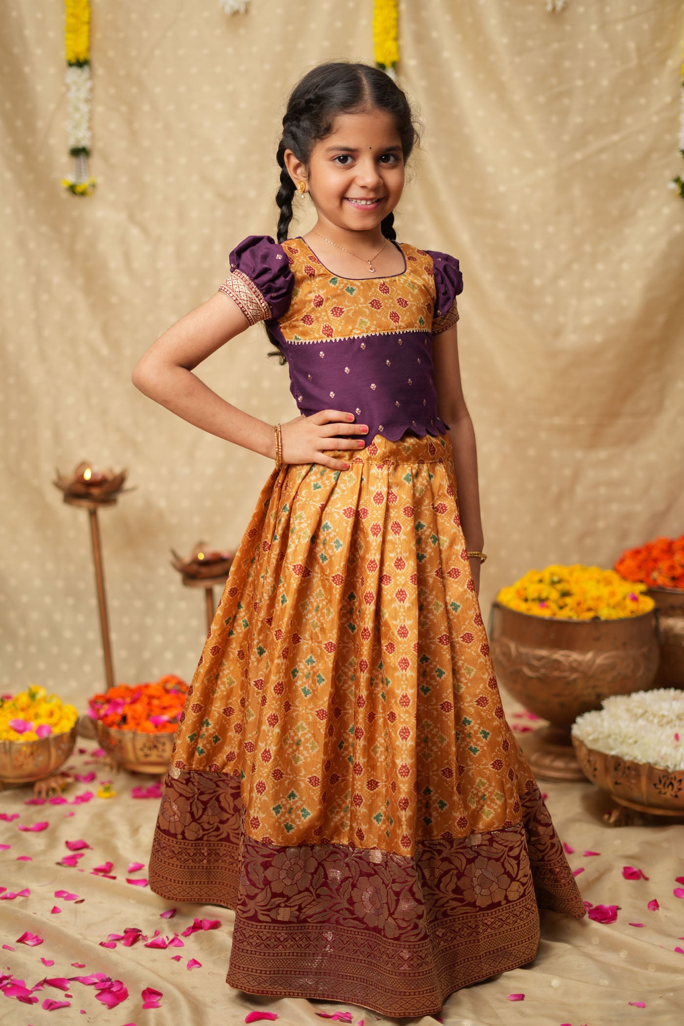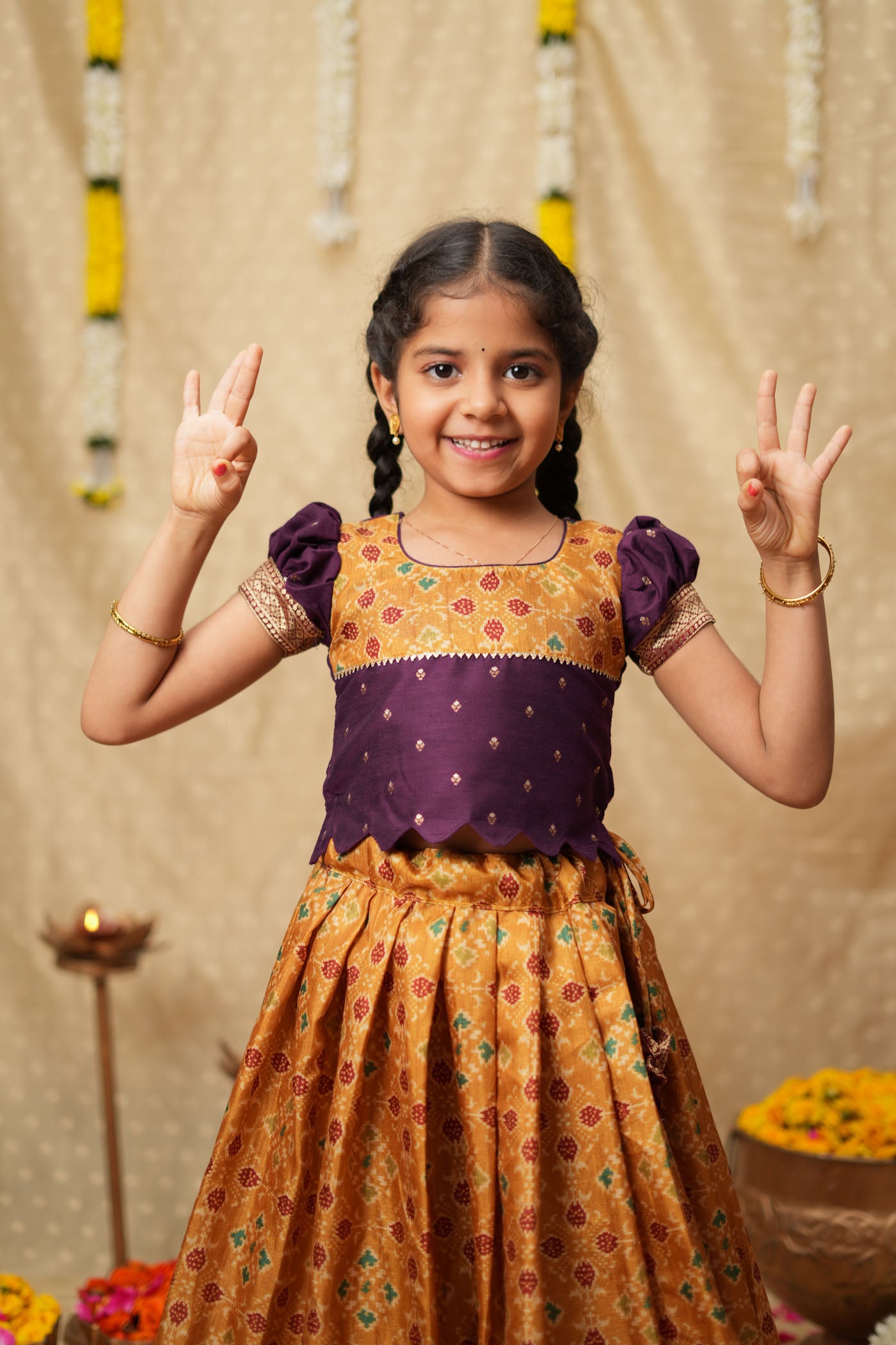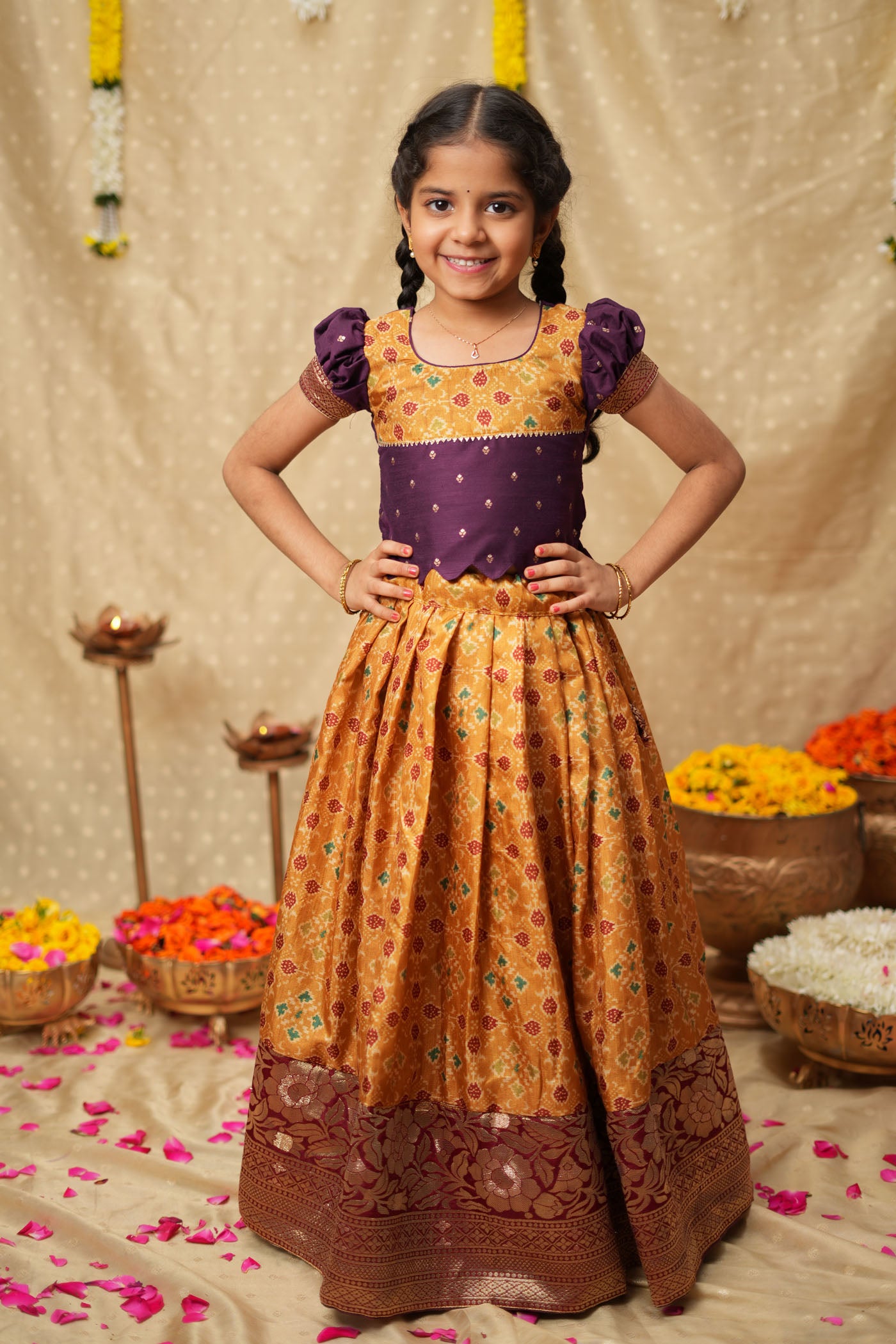 The Agalvili Wine & Yellow Lehenga Mini is a vibrant celebration of South Indian festive elegance. The wine-hued brocade blouse shimmers with zari buttis and puff sleeves, perfectly complementing the bright yellow cotton skirt adorned with intricate floral motifs and a rich Banarasi zari border. Thoughtfully designed with cotton lining for comfort, this lehenga set is as playful as it is traditional, making it the perfect choice for weddings, Navratri nights, or temple festivities.