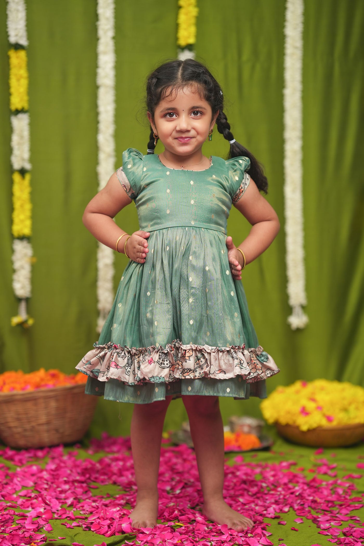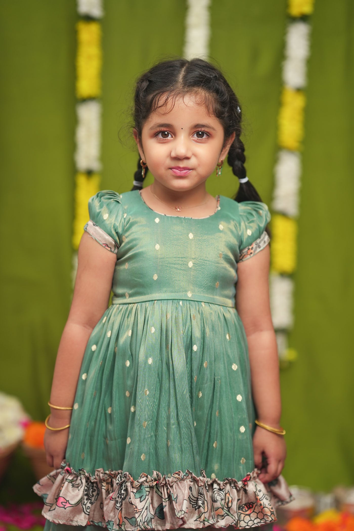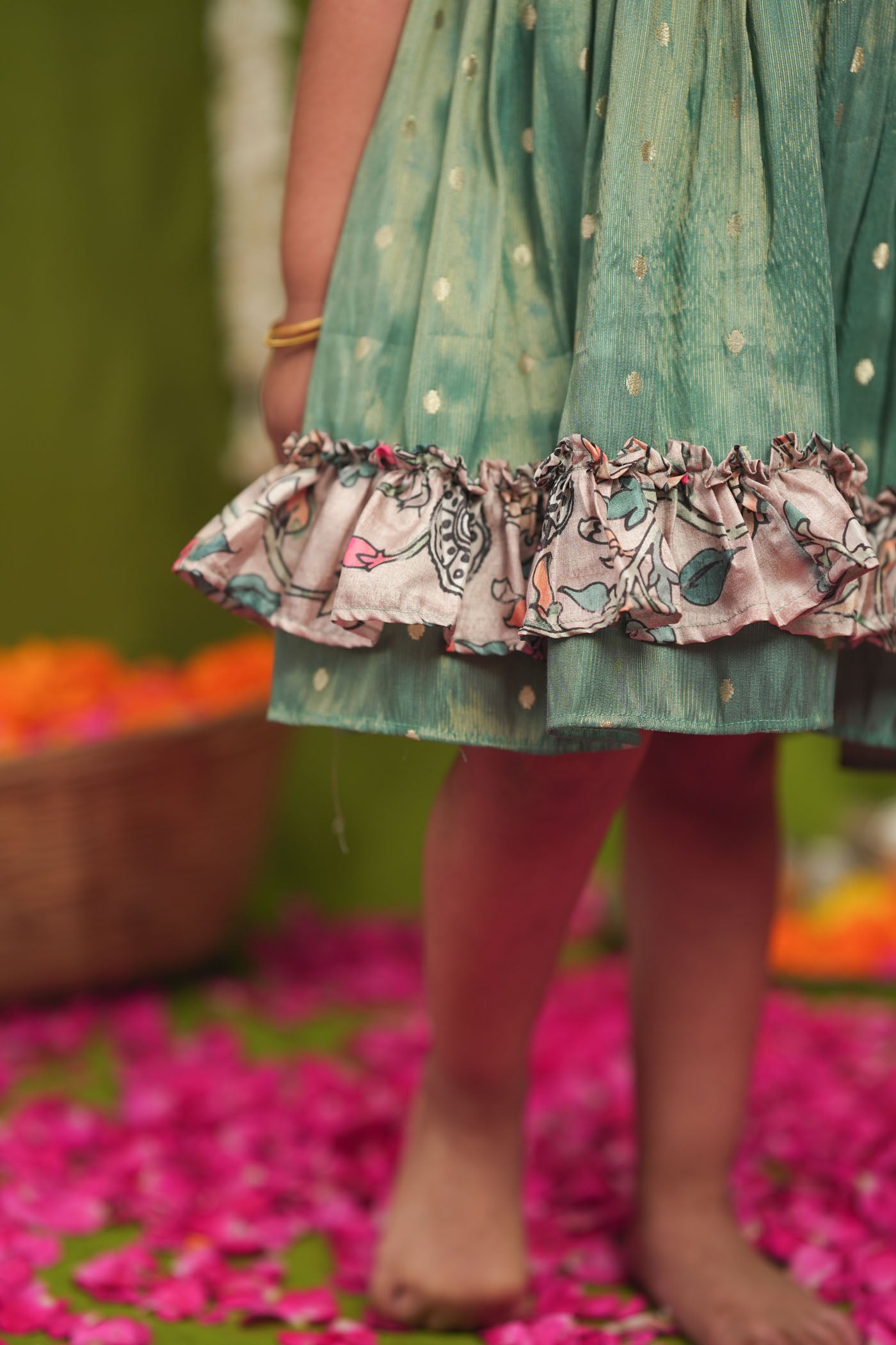 Bring a touch of pastel elegance to your little one’s festive wardrobe with the Charita Pastel Green Frock Mini. Crafted in premium shimmer tissue georgette, this frock glimmers softly with woven golden polka dots and is finished with a floral-printed ruffle border hemline that adds a playful twist. Designed with puff sleeves and a round neckline, it offers both comfort and grace for temple festivals, birthday celebrations, weddings, and Navratri evenings. Lined in cotton for breathability, this frock ensures your child can twirl, pose, and play with ease—all while looking effortlessly festive.