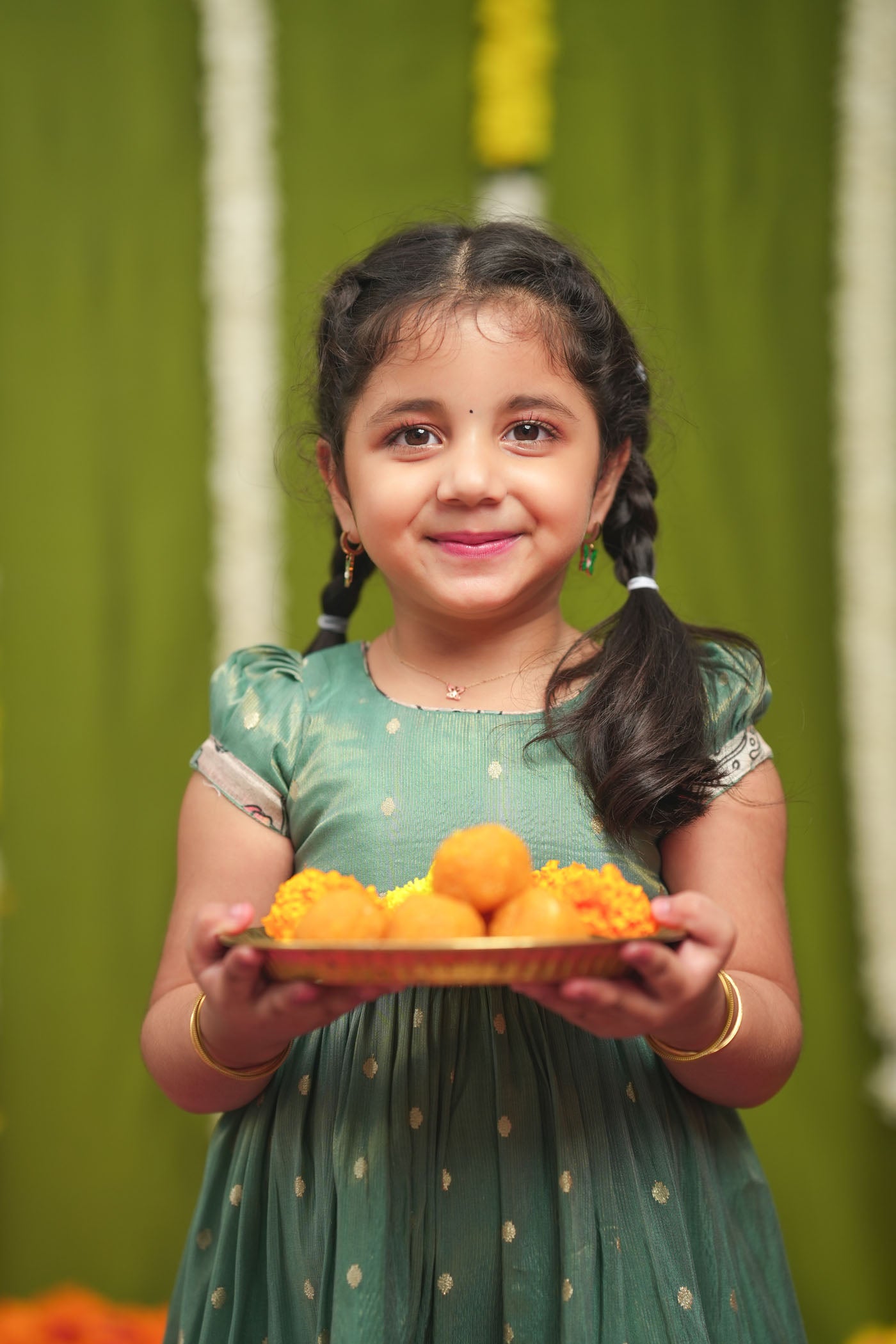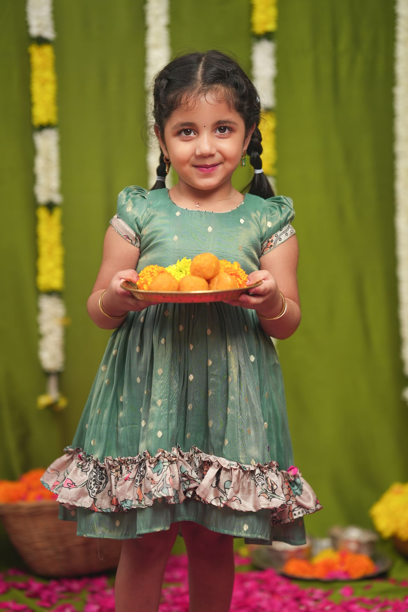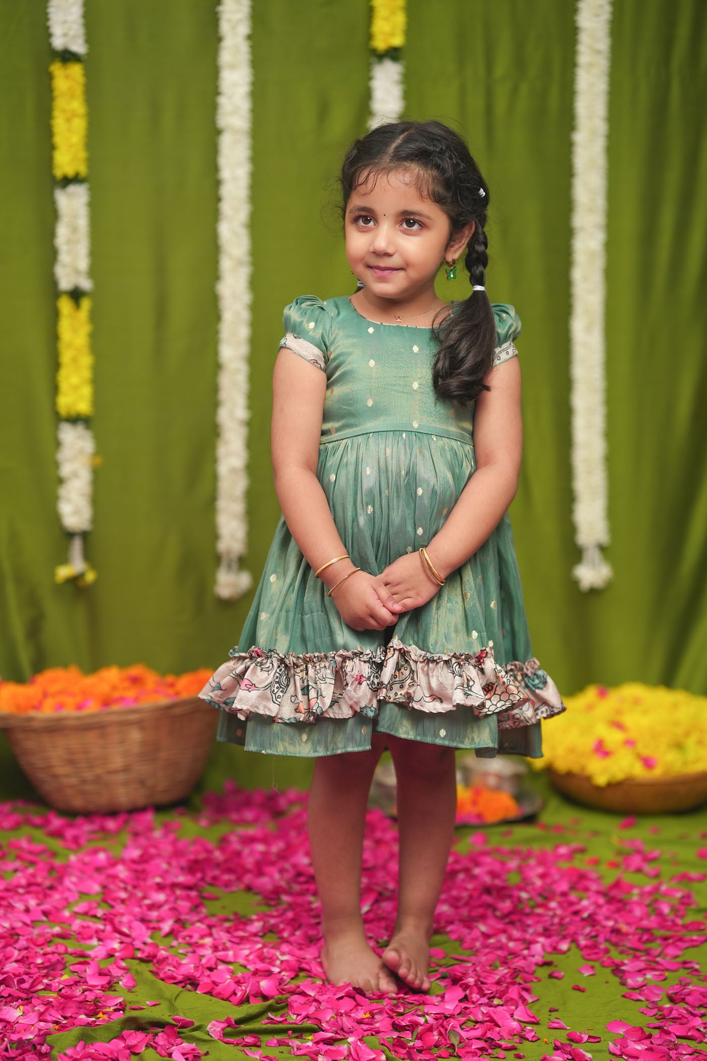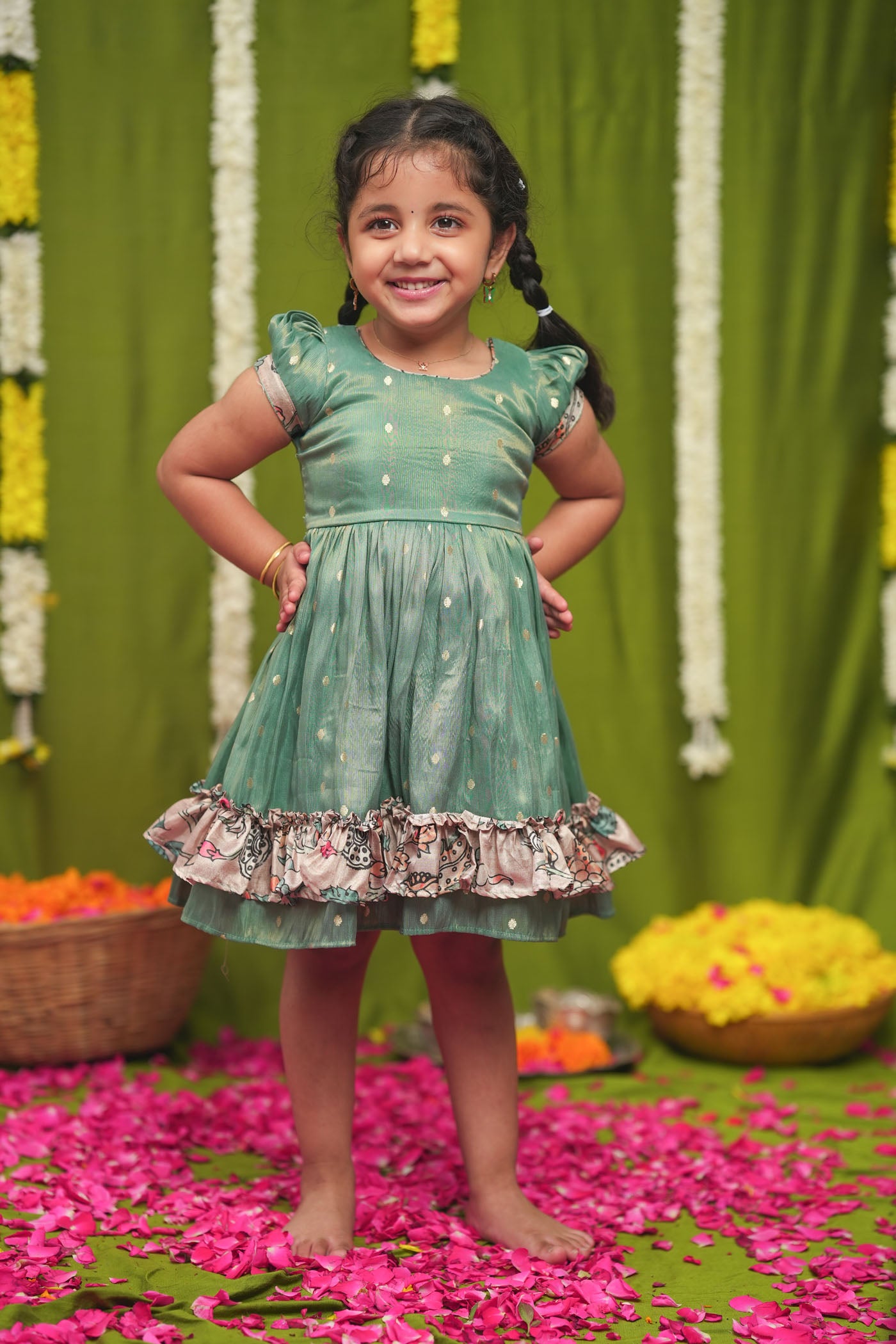 Bring a touch of pastel elegance to your little one’s festive wardrobe with the Charita Pastel Green Frock Mini. Crafted in premium shimmer tissue georgette, this frock glimmers softly with woven golden polka dots and is finished with a floral-printed ruffle border hemline that adds a playful twist. Designed with puff sleeves and a round neckline, it offers both comfort and grace for temple festivals, birthday celebrations, weddings, and Navratri evenings. Lined in cotton for breathability, this frock ensures your child can twirl, pose, and play with ease—all while looking effortlessly festive.