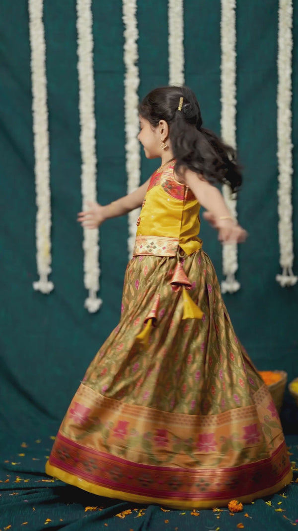 Let your little one light up the room in the Cynthia Mustard Yellow Lehenga Mini, a vibrant fusion of age-old artistry and festive joy. The blouse, crafted from rich silk blend with delicate zari buttis and brocade accents, pairs beautifully with a soft cotton-silk lehenga in an ikat-inspired weave.