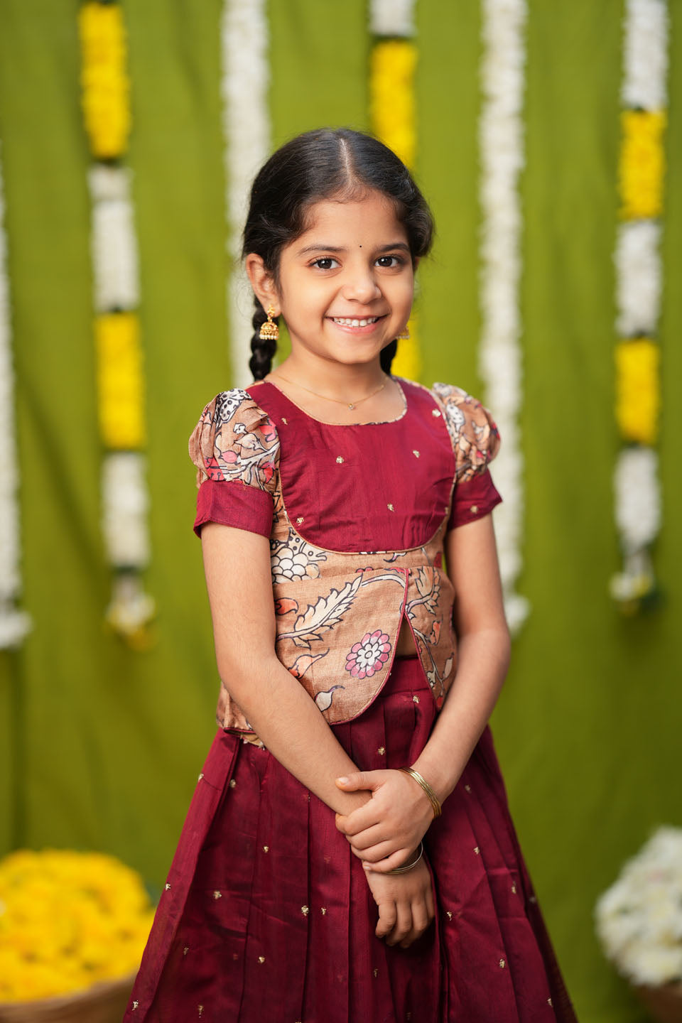 Introduce your little one to the joy of festive fashion with the Darshini Red Peplum Set—a harmonious blend of classic Indian craftsmanship and contemporary flair. The luxurious maroon chanderi skirt sparkles with delicate gold buti embroidery, while a structured cotton-silk kalamkari overlay adds a chic layered look to the blouse. Designed to charm at every occasion, Darshini is where floral artistry meets regal color—perfect for weddings, poojas, and every celebration in between.