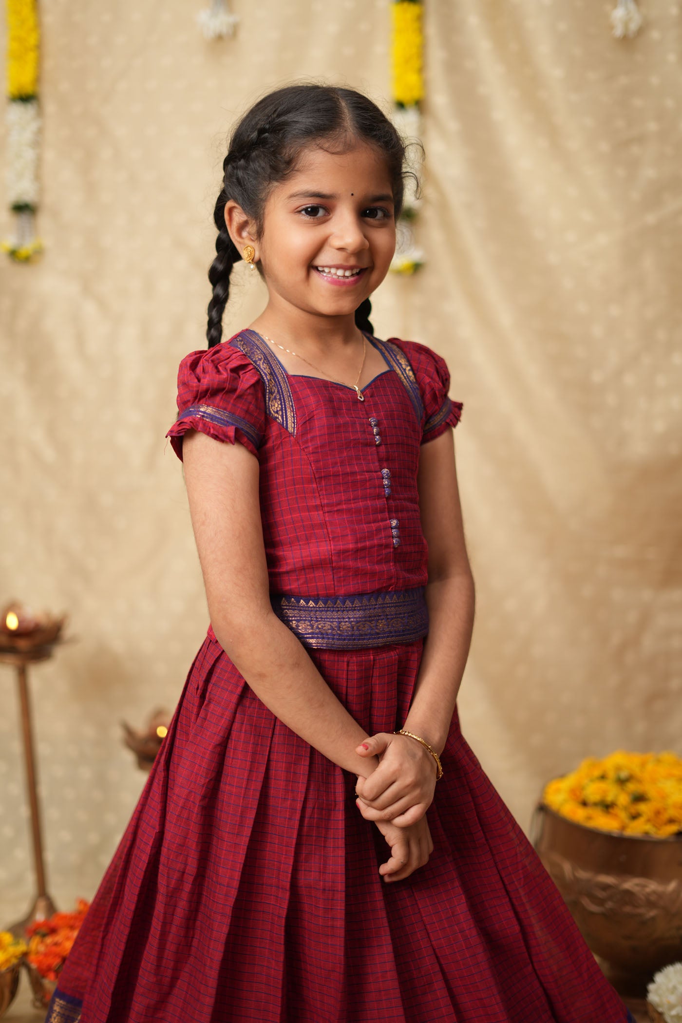 The Esha Red Check Lehenga Mini captures the timeless beauty of Chettinad handwoven cotton, bringing to life a festive favourite for little girls. The radiant red and blue combination, paired with intricate zari borders and traditional check patterns, embodies the grace of South Indian craftsmanship. With its sweetheart neckline, puff sleeves, and pleated flared lehenga, this ensemble blends cultural heritage with playful comfort—perfect for temple visits, festive family gatherings, and celebrations.