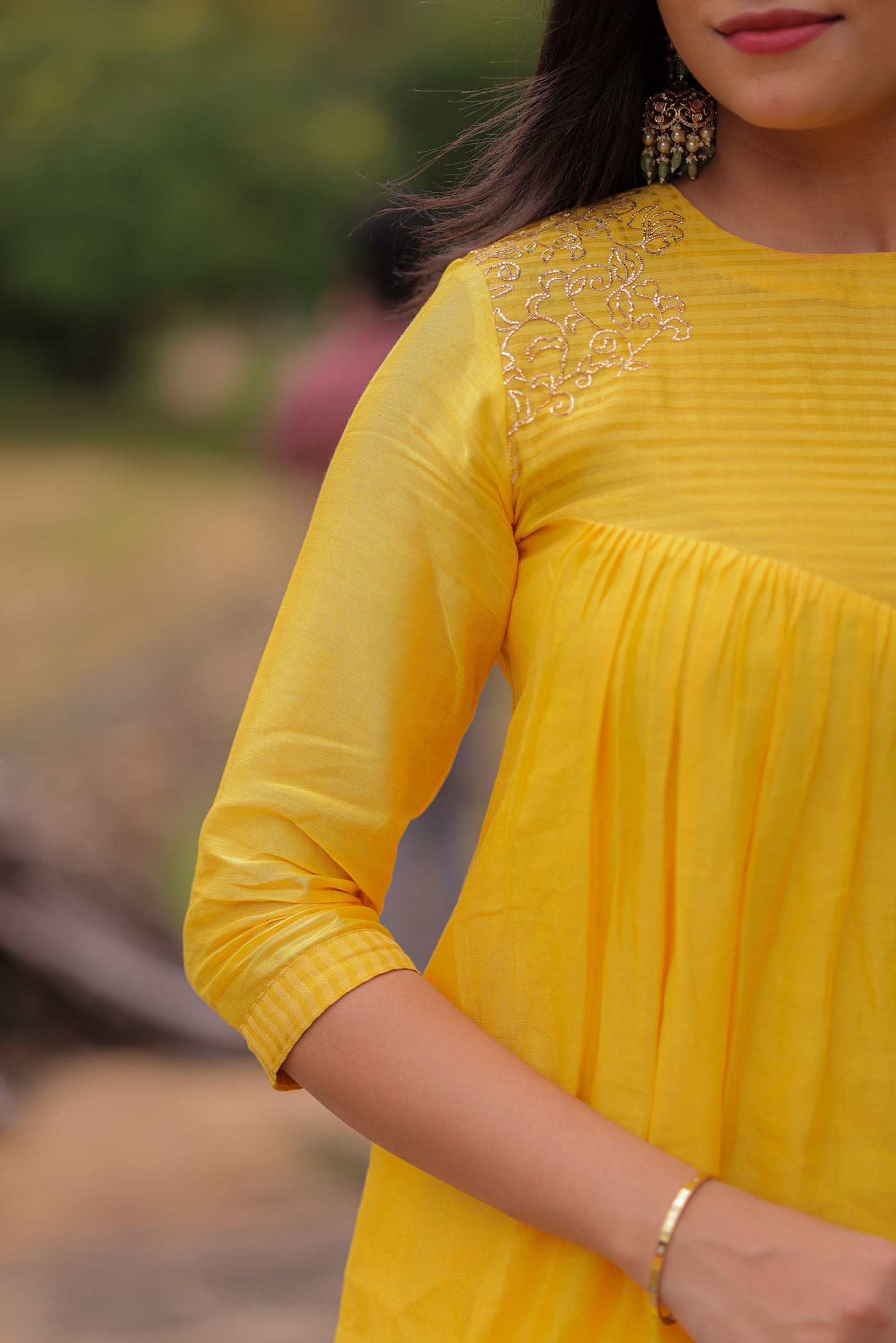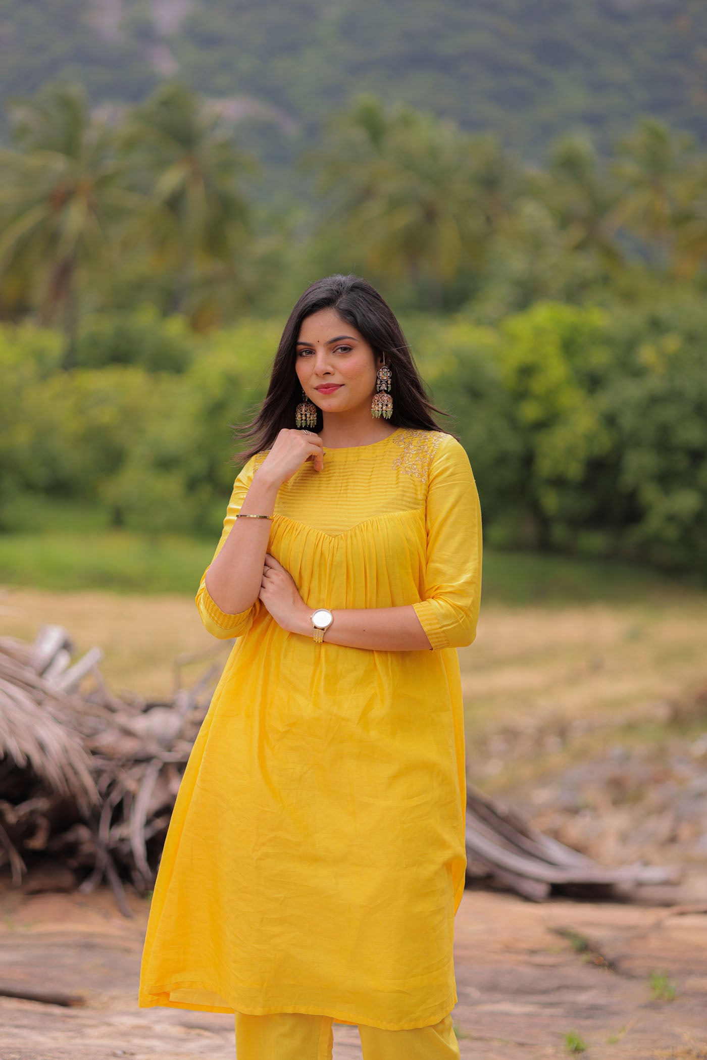 The Golden Yellow Embroidered A-Line Kurta Set is a radiant expression of festive simplicity and grace. Crafted from lustrous Chanderi fabric, it features delicate embroidery around the neckline and shoulders, adding a refined touch to its minimal silhouette. Designed in a flared A-line fit, this set is both elegant and comfortable — making it perfect for haldi, mehendi, or daytime festive gatherings.