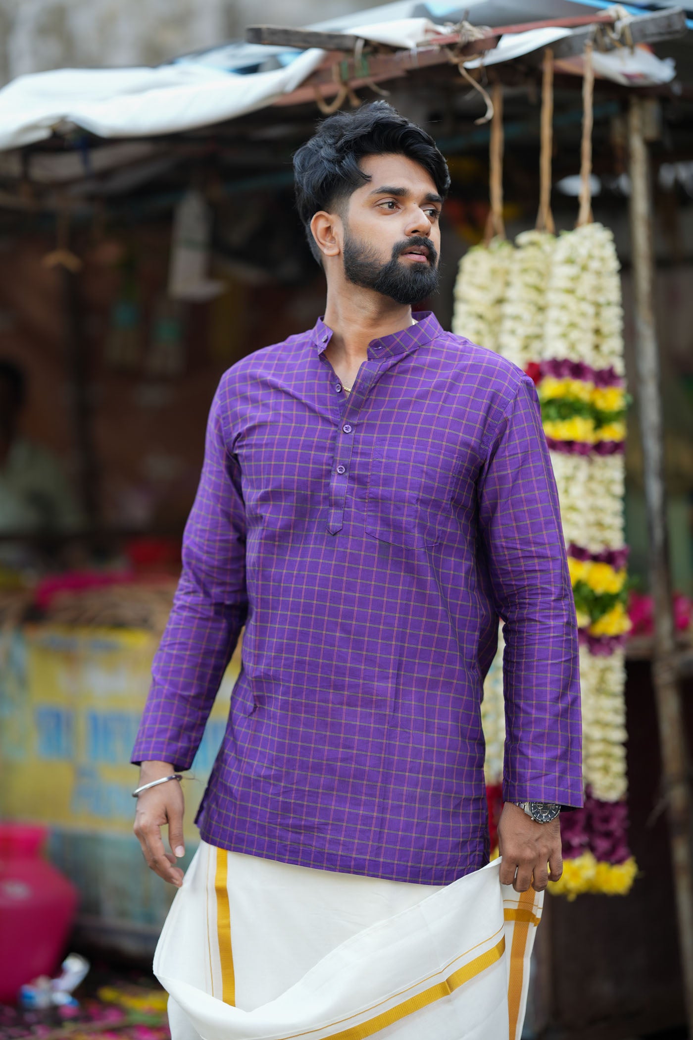 The Maayan Purple Shirt brings together the richness of handloom cotton-silk blend with a woven check pattern that radiates subtle sophistication. Designed with a tailored fit and mandarin collar, this shirt embodies cultural elegance while ensuring everyday comfort. Perfect for Navratri, Diwali, temple festivities, or weddings, its artisanal texture celebrates South Indian heritage with a modern touch.