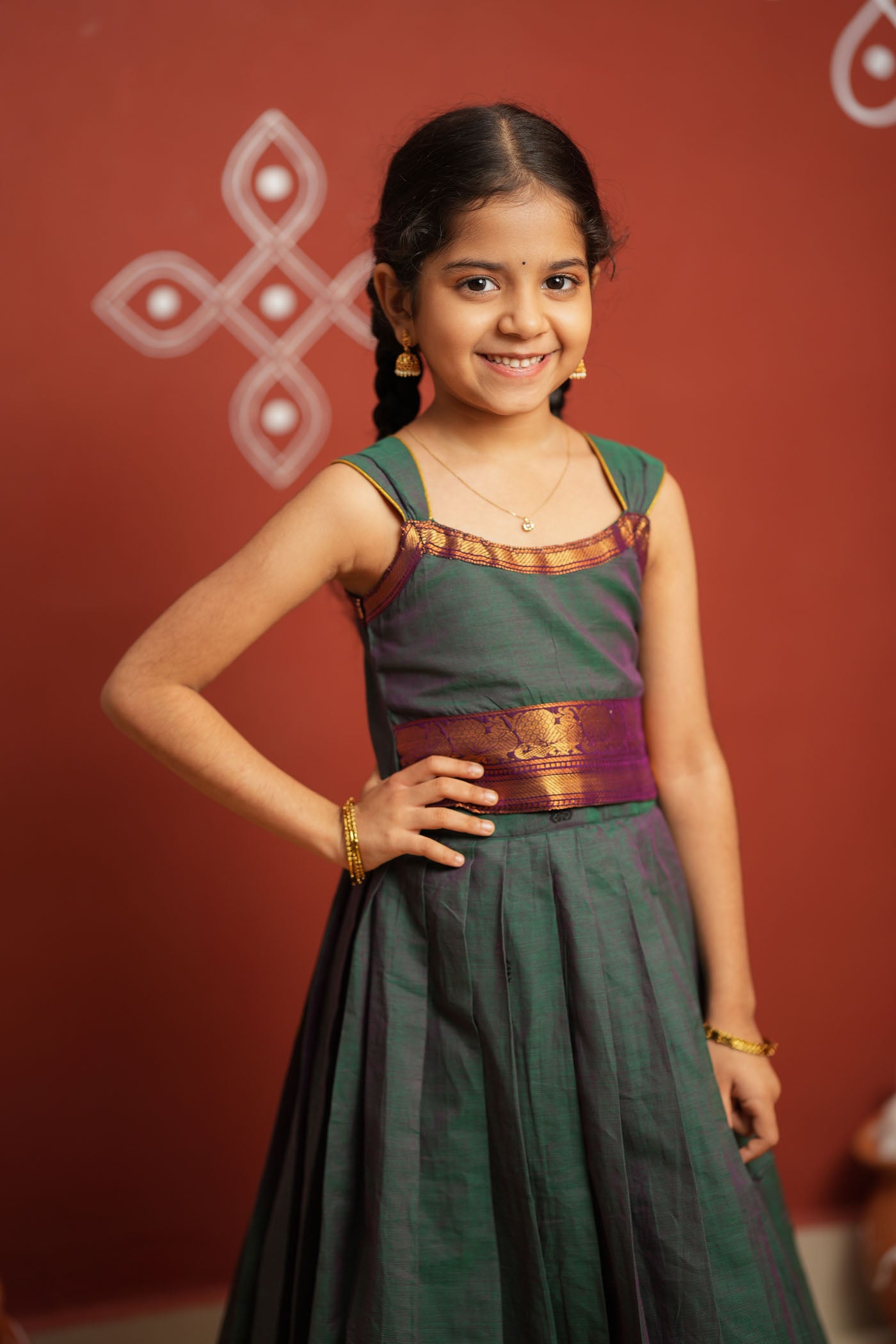 • Skirt: Chettinad cotton lehenga with magenta temple zari border