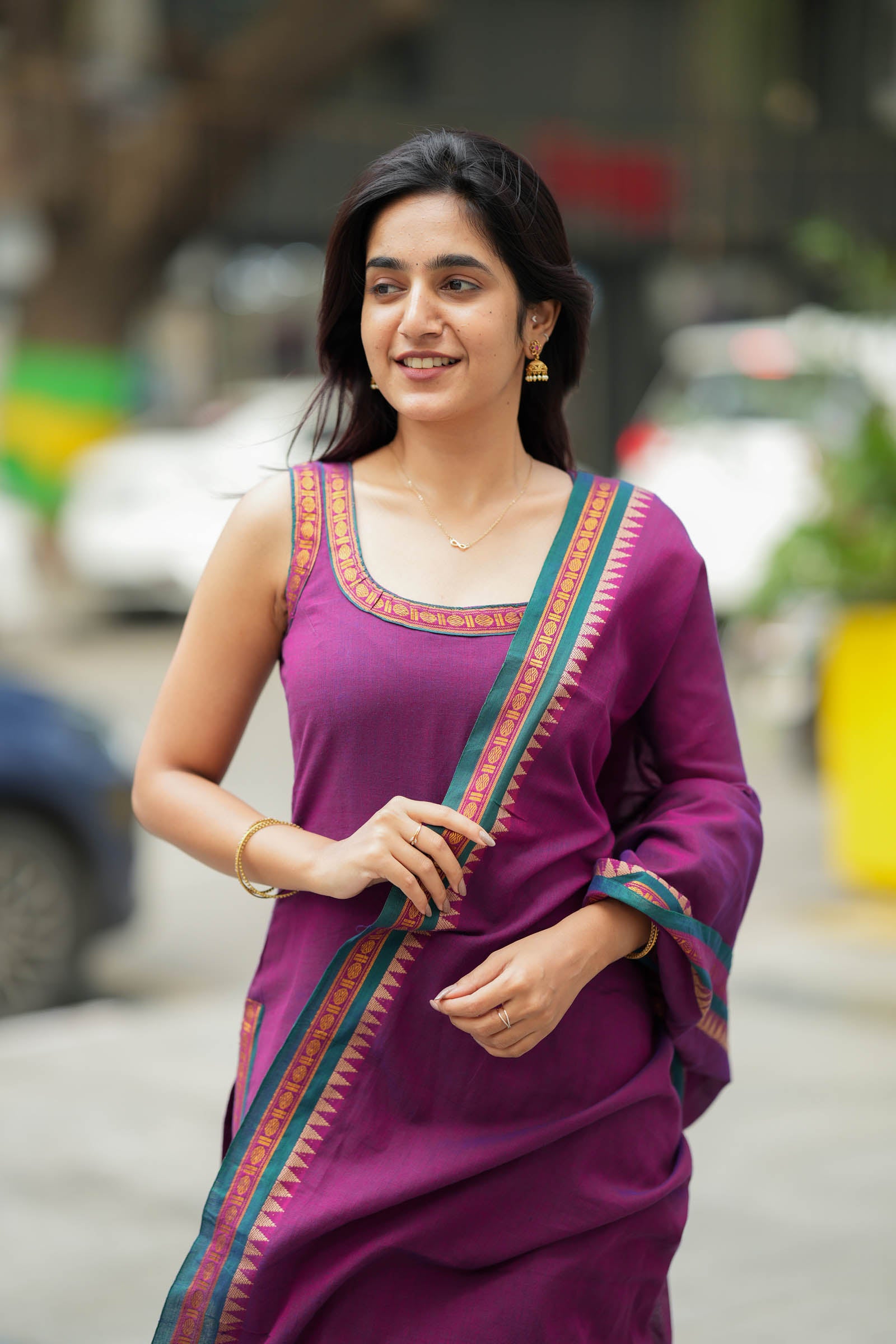 - Dupatta: Narayanpet cotton with woven temple-border finish