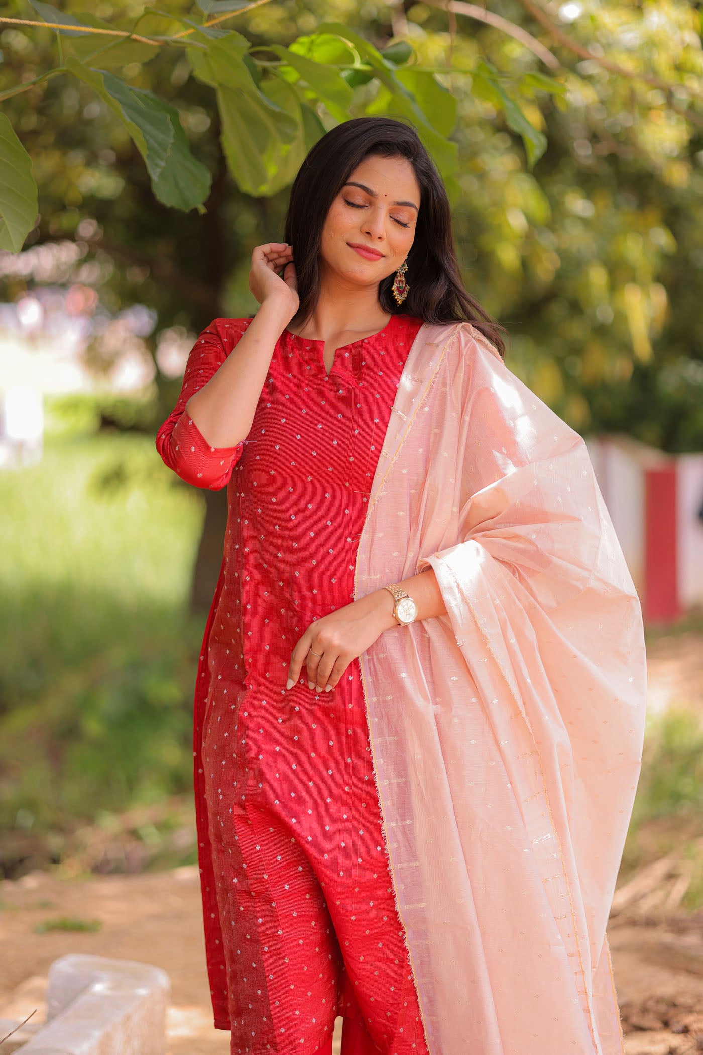 The Sindoori Banaras A-Line Kurta with Dupatta in rich crimson red celebrates traditional craftsmanship with a touch of modern finesse. Made from Tissue Banarasi fabric adorned with delicate zari dots, itâs paired with a lightweight sheer pink dupatta, creating a perfect contrast thatâs festive yet understated. Designed in a flared A-line silhouette, itâs ideal for pujas, family gatherings, and festivals that call for elegance and ease.