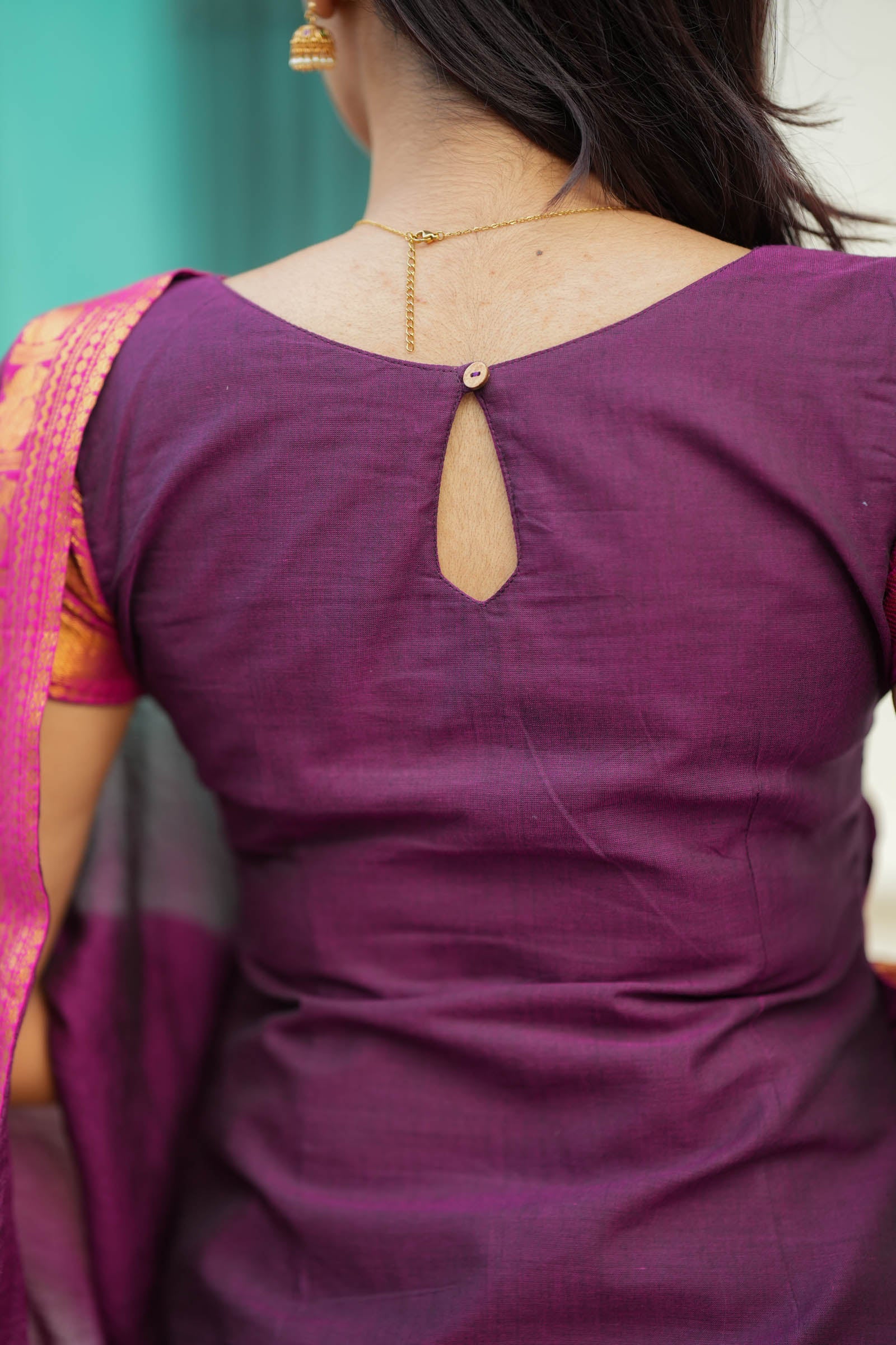 Celebrate the beauty of South Indian heritage with the Tamizh Violet Mom & Me Set, a graceful twinning ensemble designed for mothers and daughters who love dressing in tradition together. Crafted from authentic Chettinad handloom cotton, this coordinated set brings together rich violet tones, vibrant pink zari borders, and timeless temple-inspired detailing.